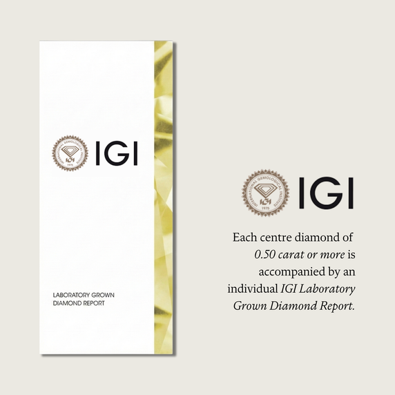 Each centre diamond of 0.50 carat or more is accompanied by an individual IGI laboratory grown diamond report.