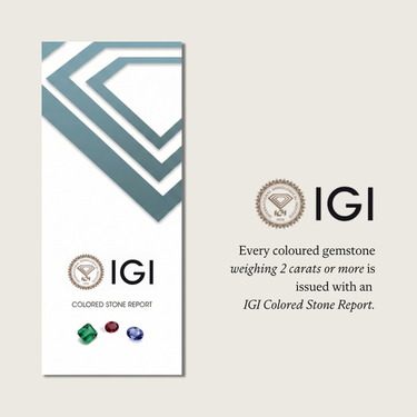 All our lab-grown diamonds over 0.5ct and gemstones over 2.0ct come with a dedicated IGI report. For designs set with three or more gemstones and a total carat weight of 2 carats or above, we provide an IGI jewellery report instead.