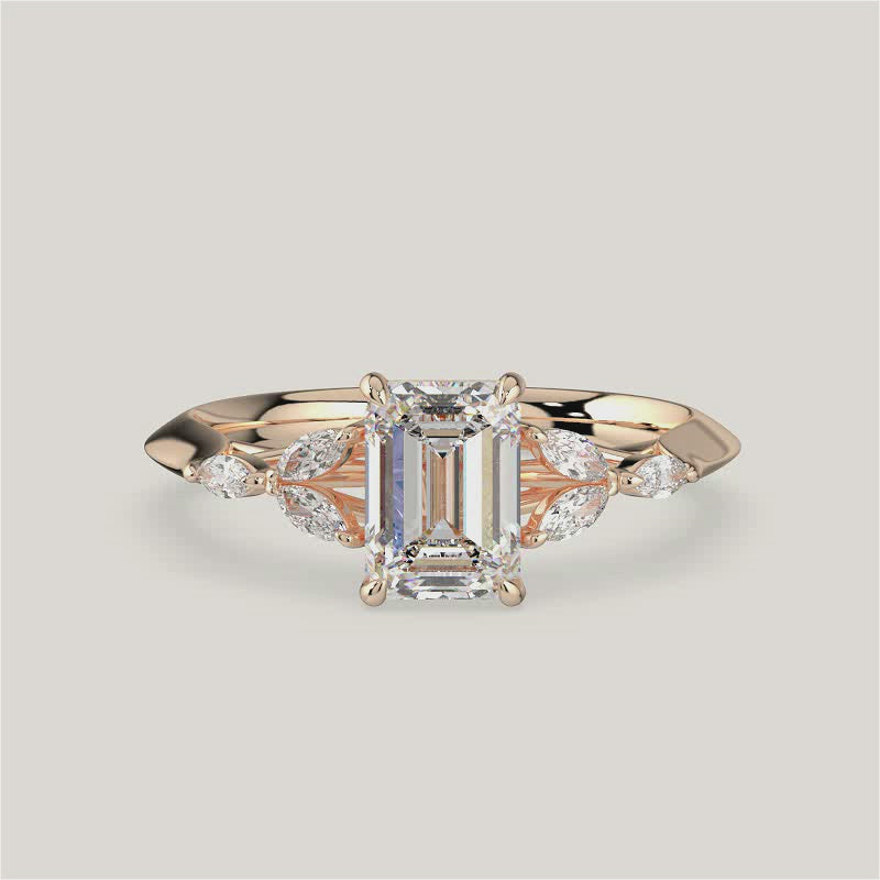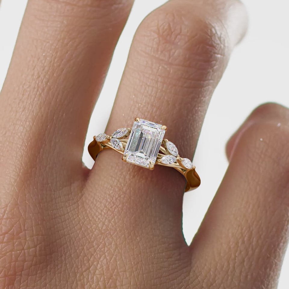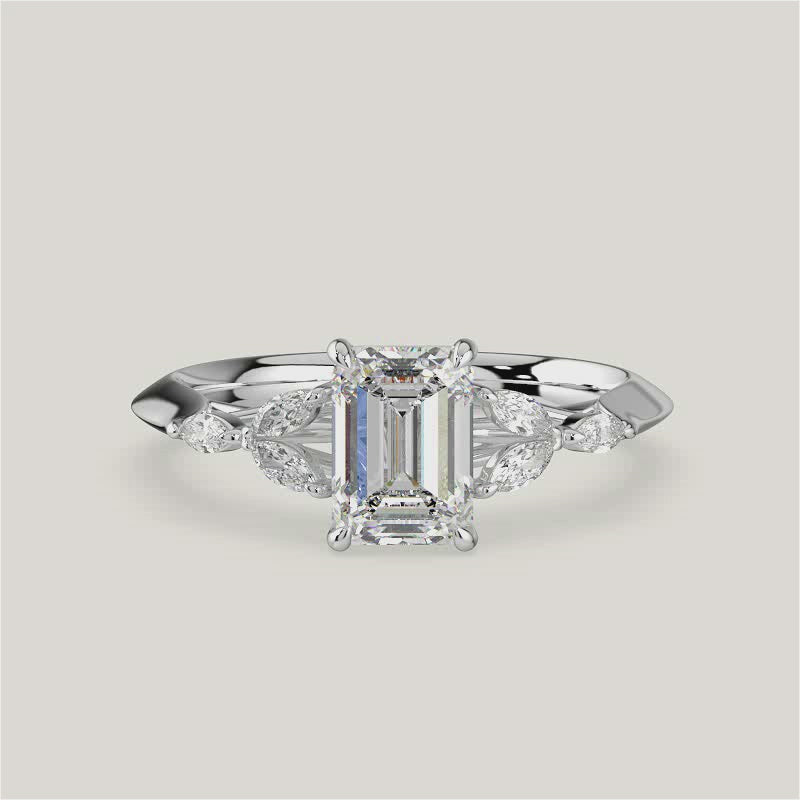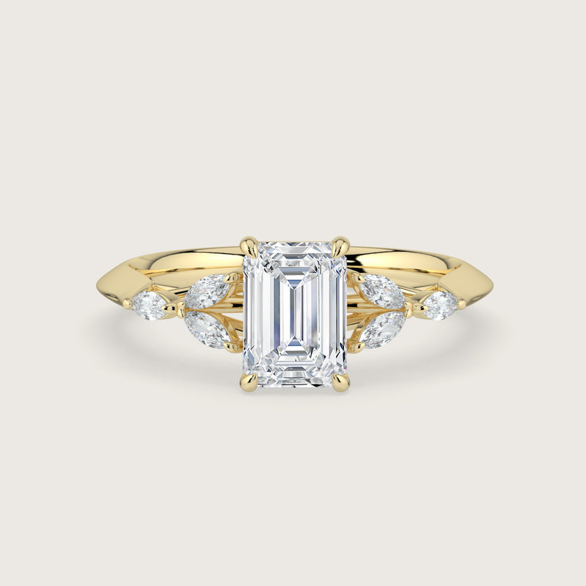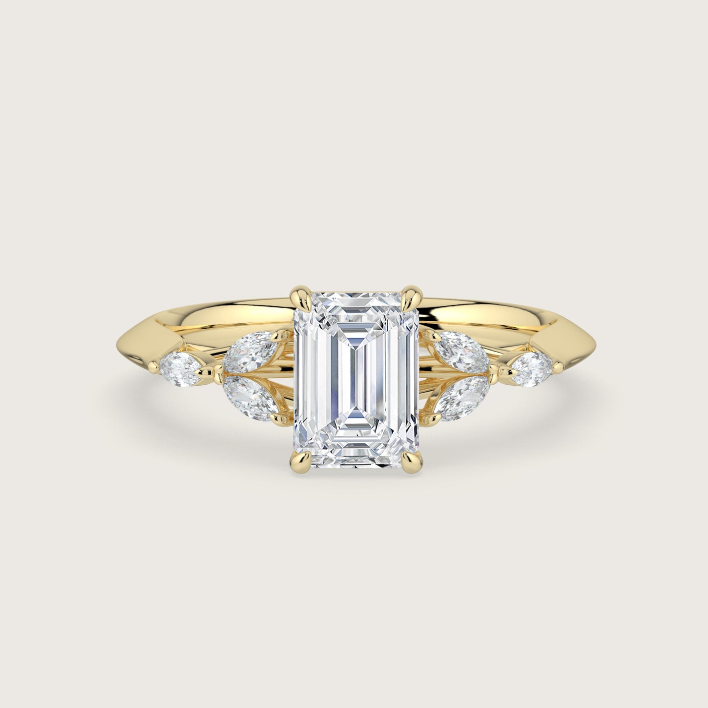 Blossom, Emerald Cut Diamond Ring with Marquise Diamond Accents