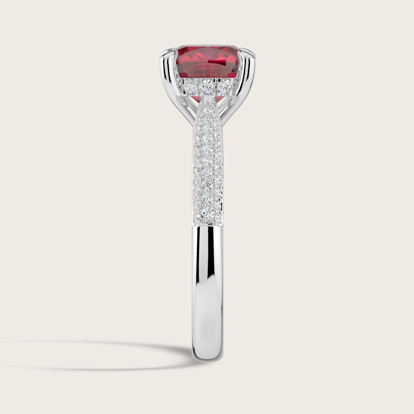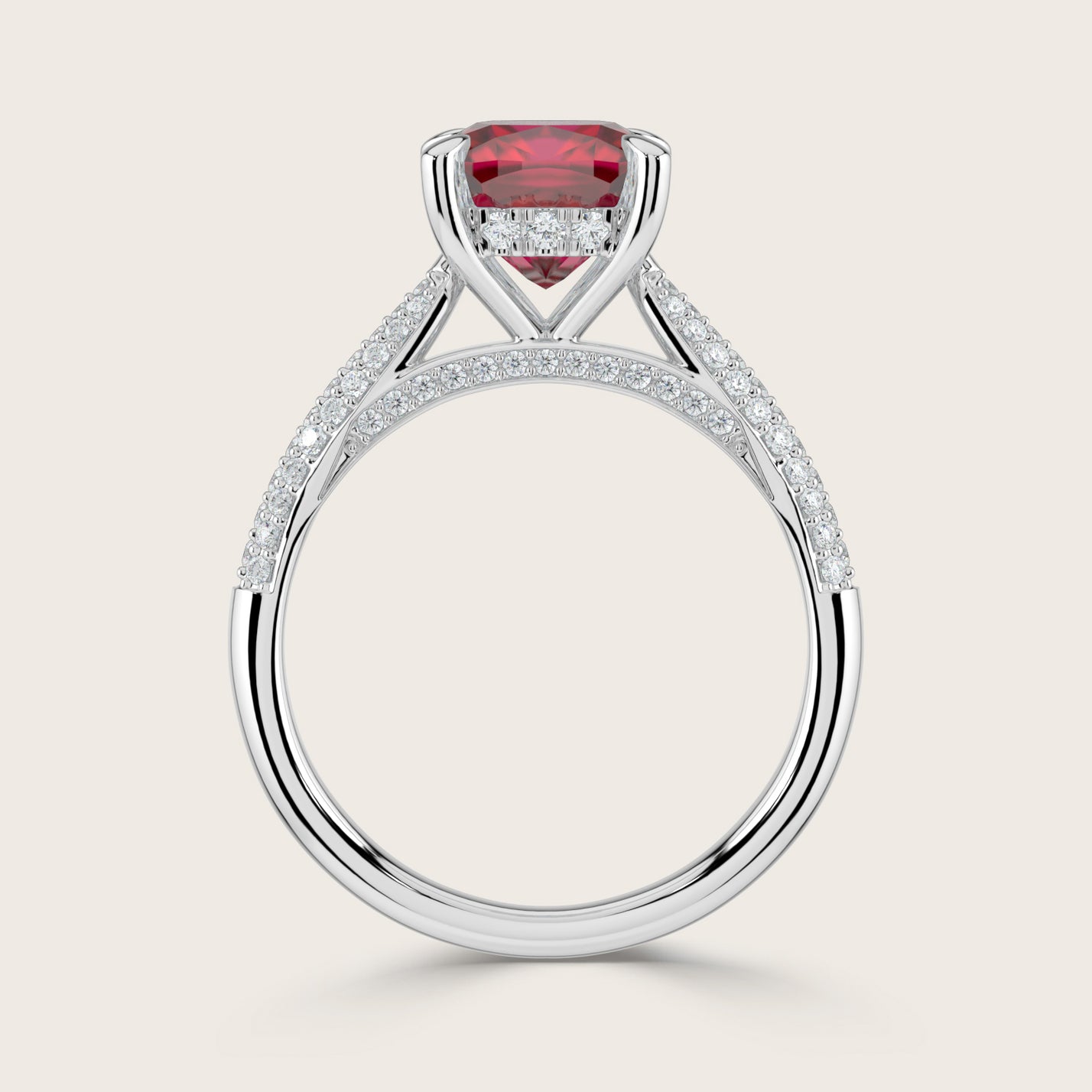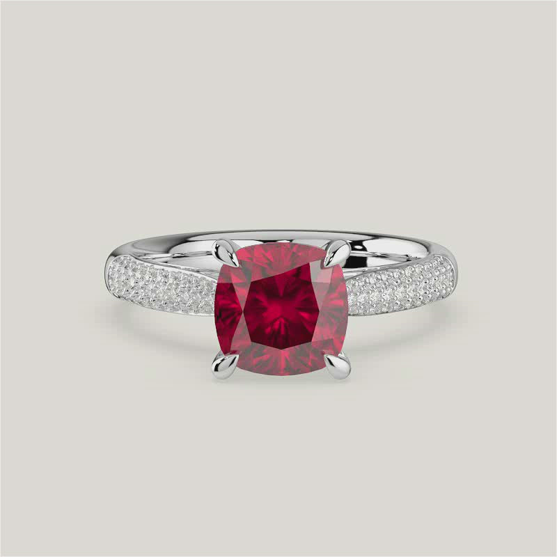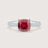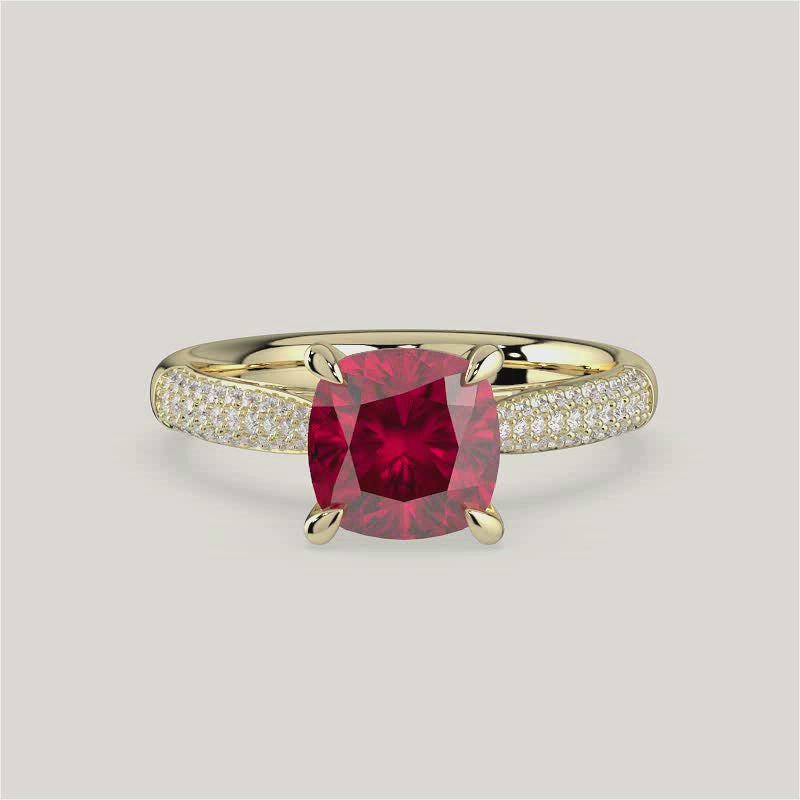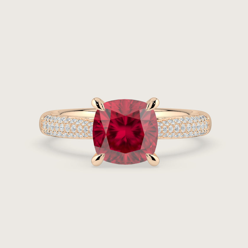 Clarisse, Cushion Cut Ruby Triple Pavé Ring with Hidden Halo