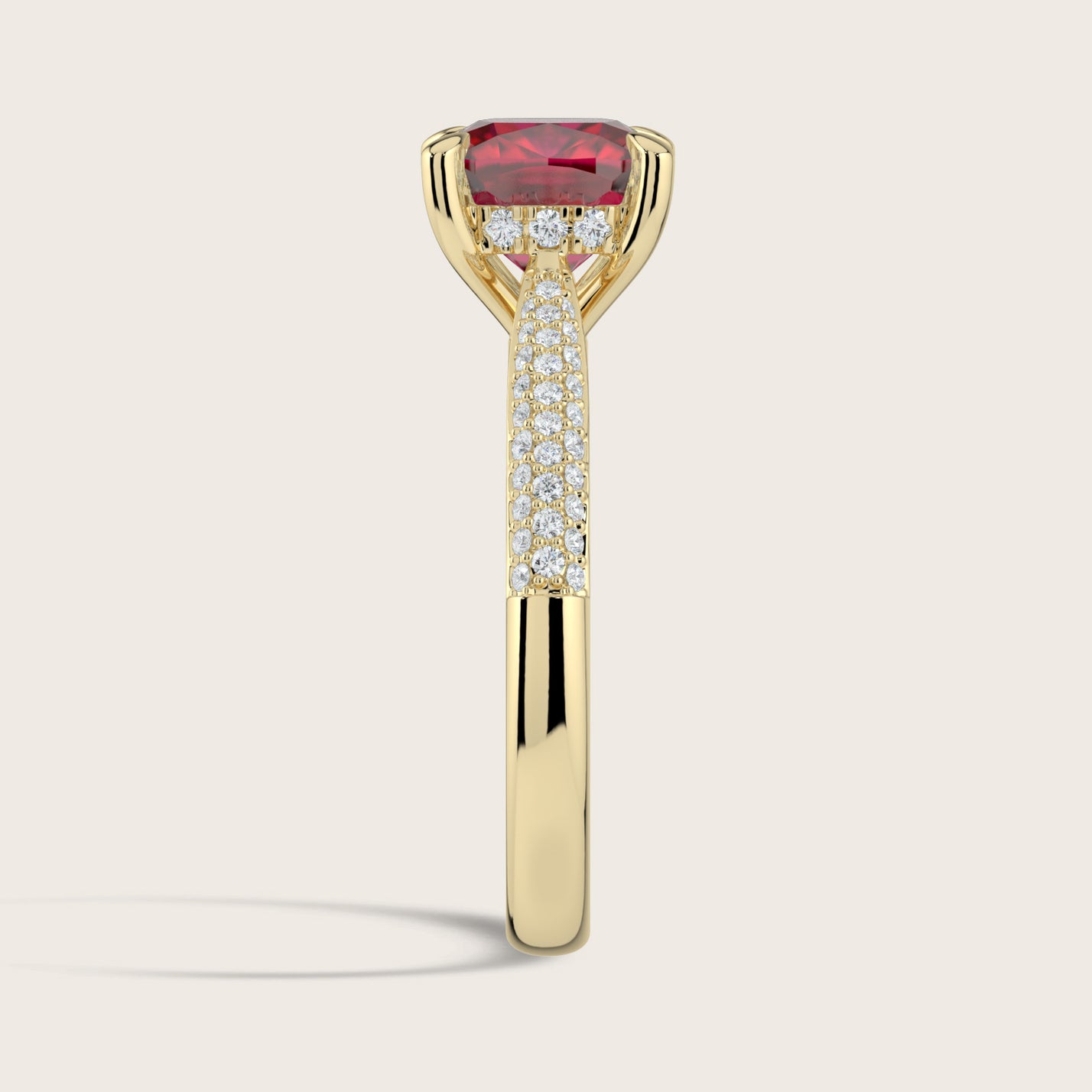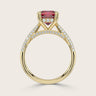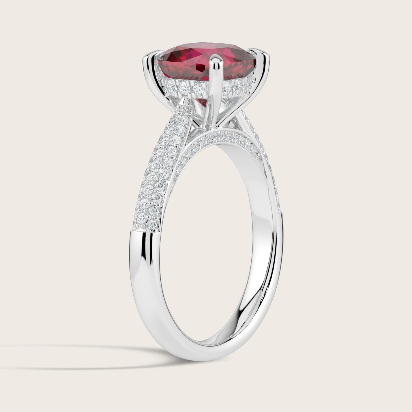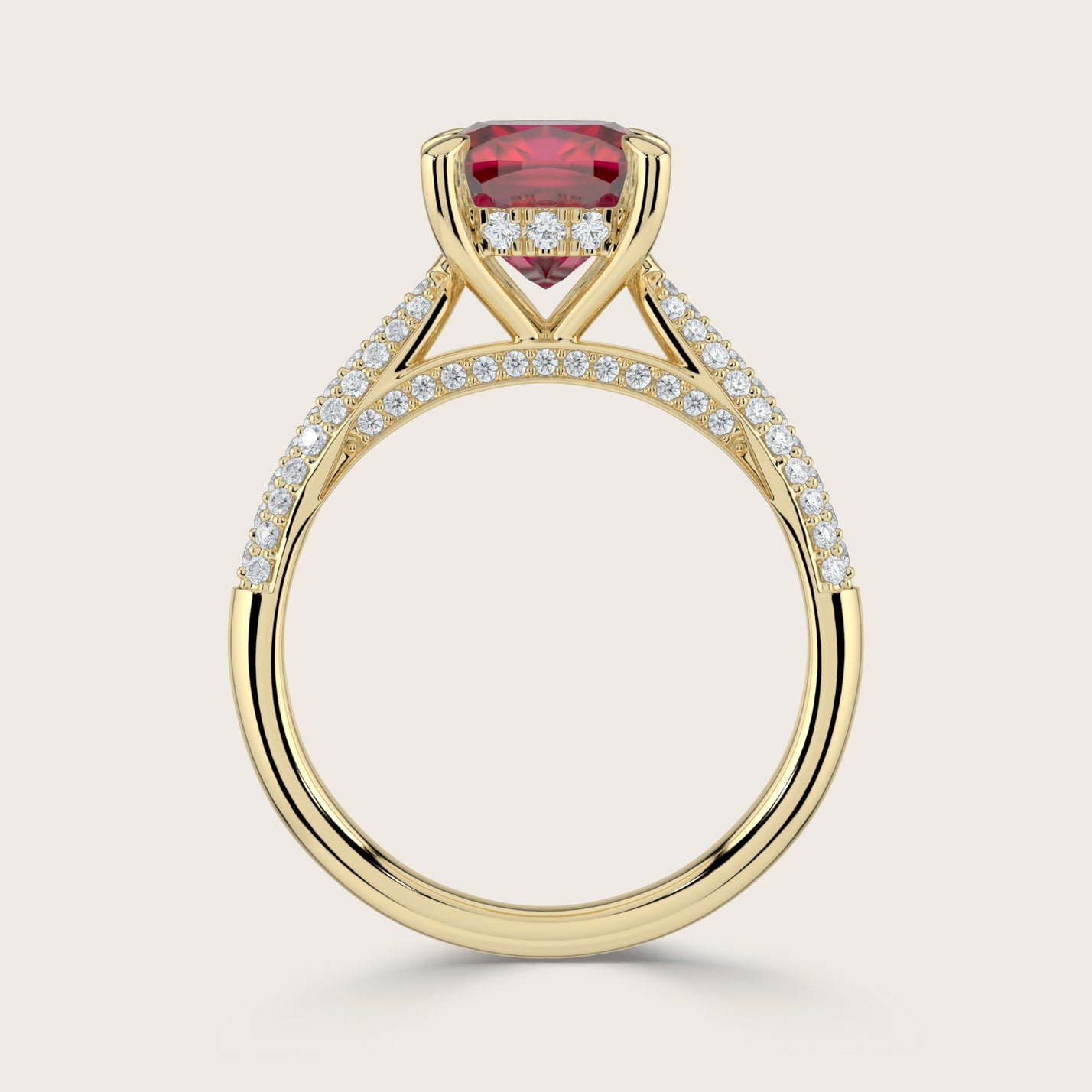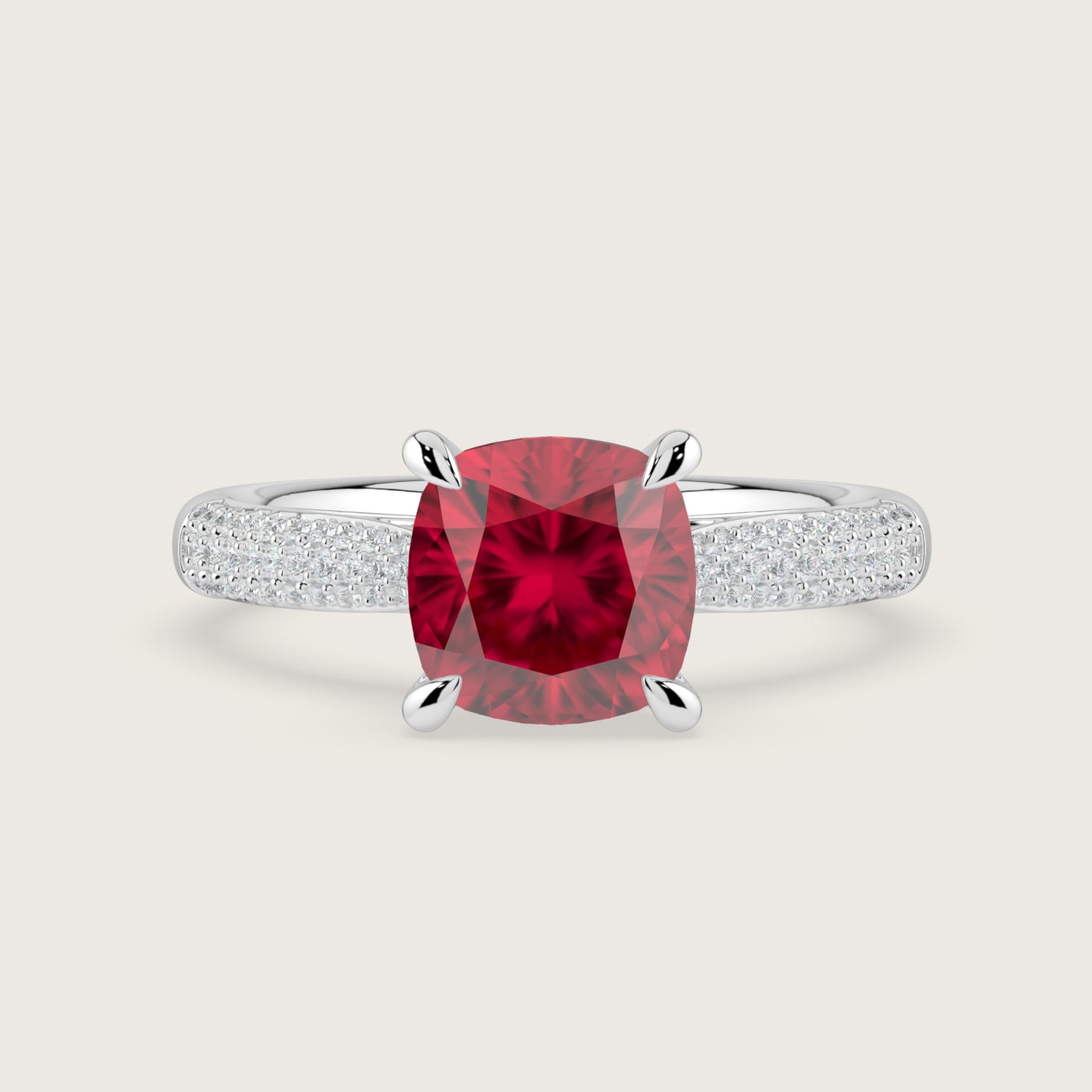 Clarisse, Cushion Cut Ruby Triple Pavé Ring with Hidden Halo