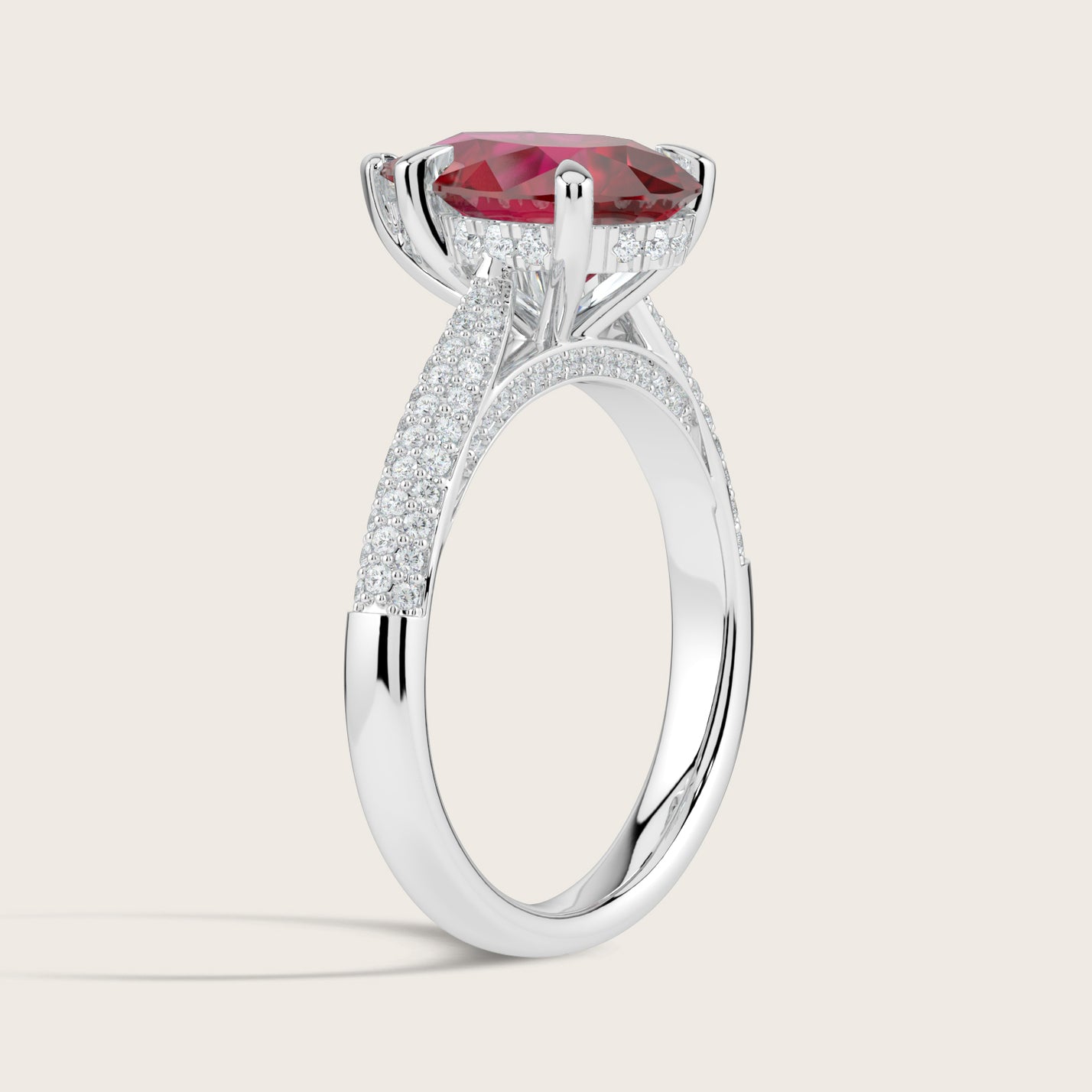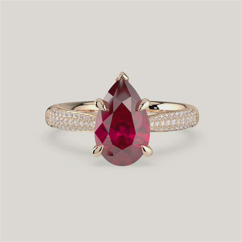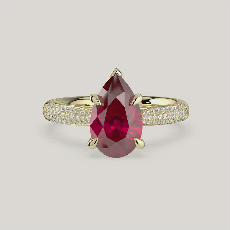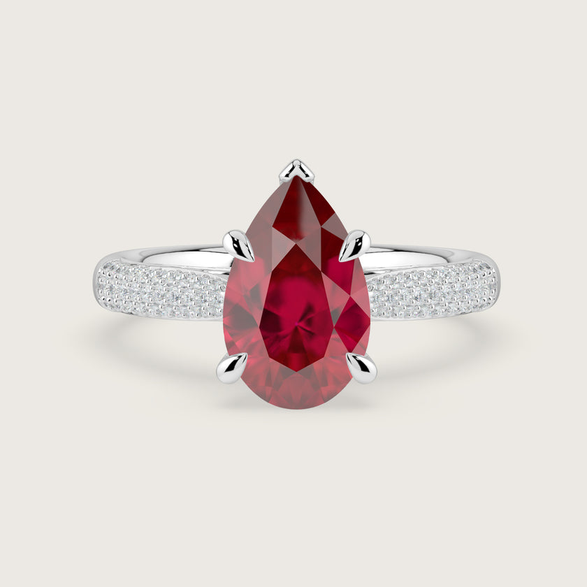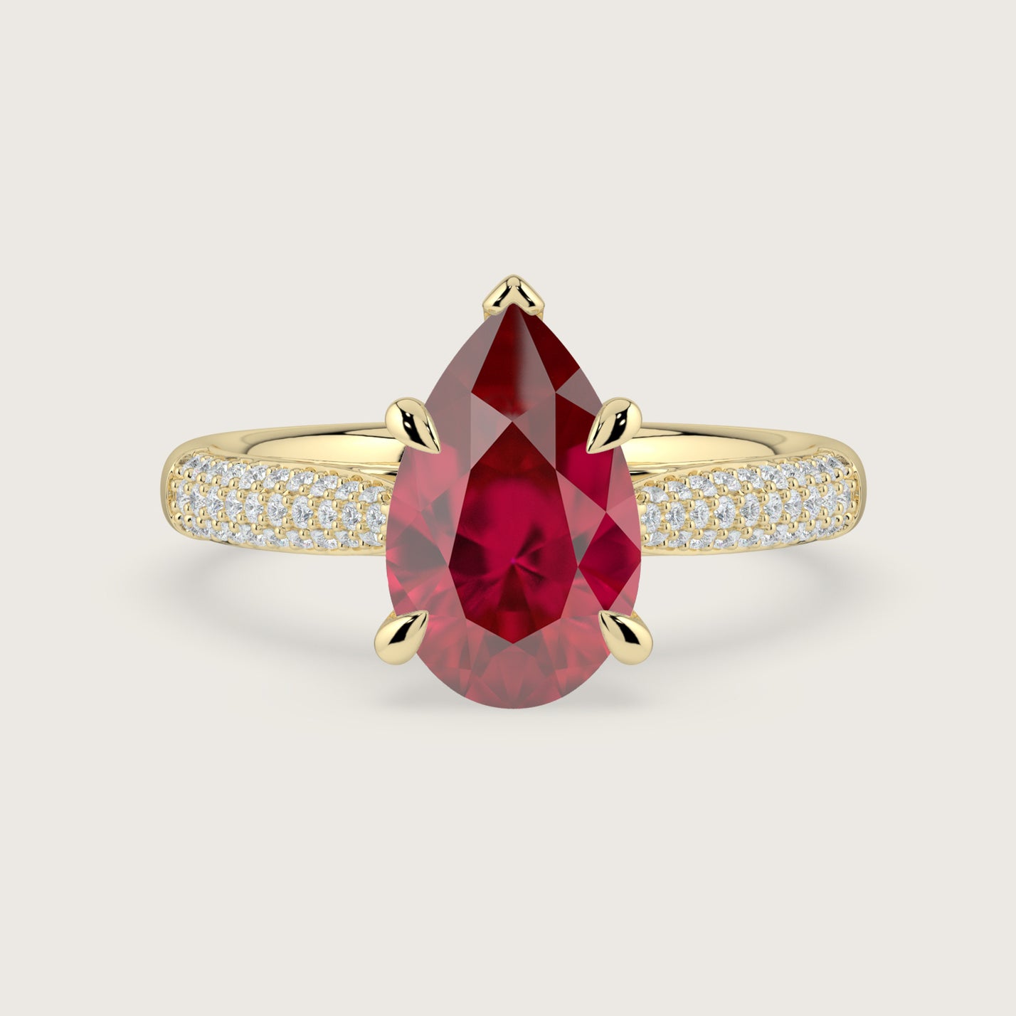 Clarisse, Pear Cut Ruby Triple Pavé Ring with Hidden Halo
