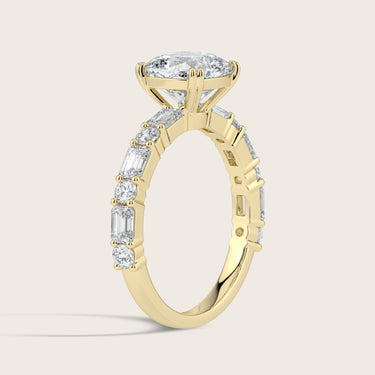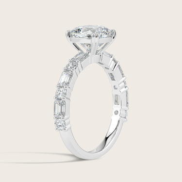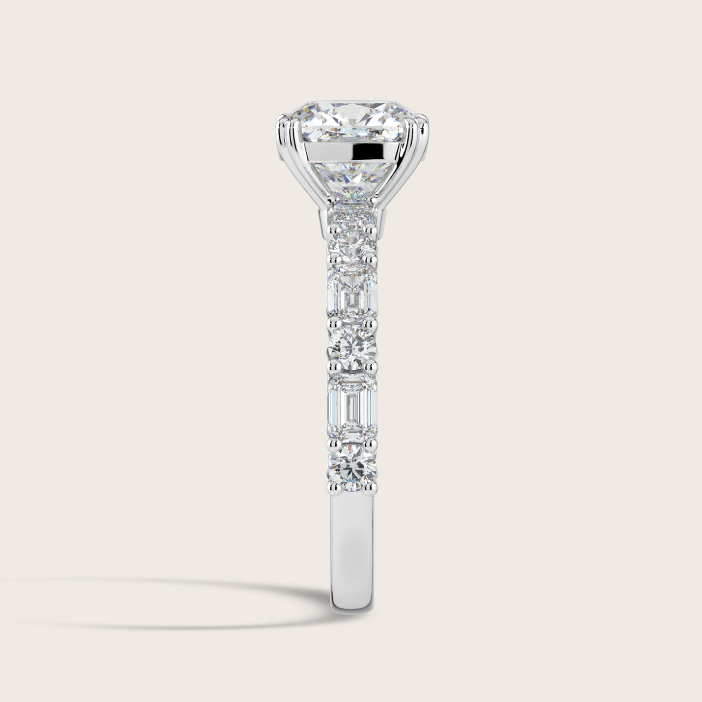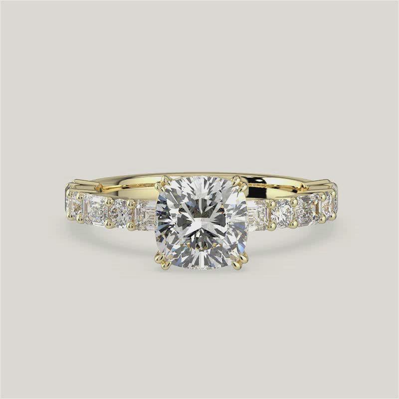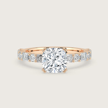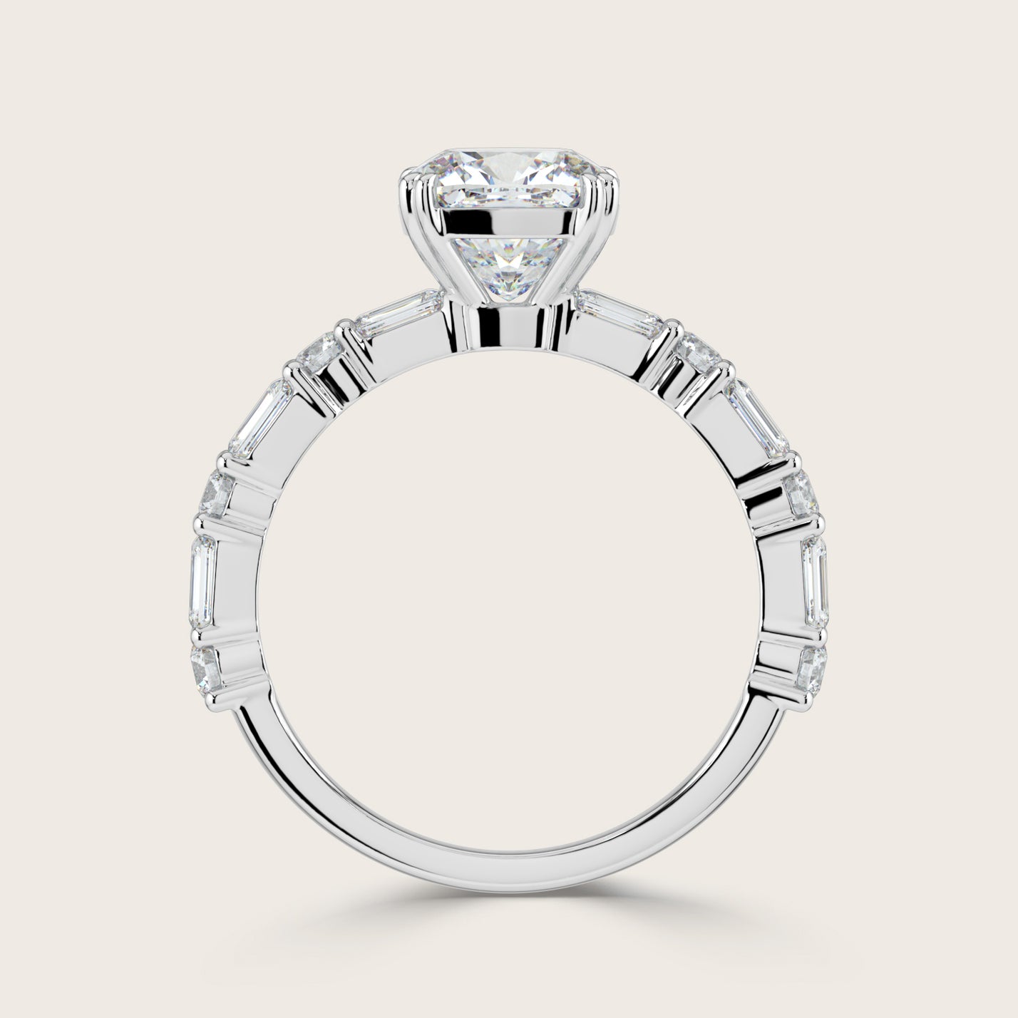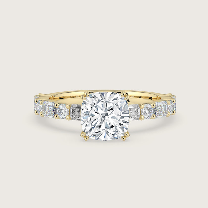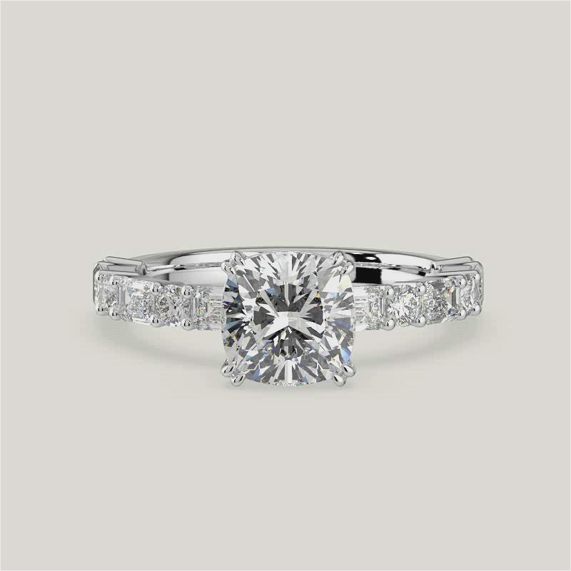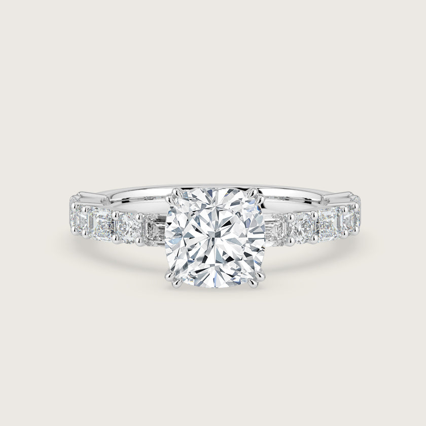 Edith, Cushion Cut Diamond Ring with Round & Baguette Pavé