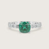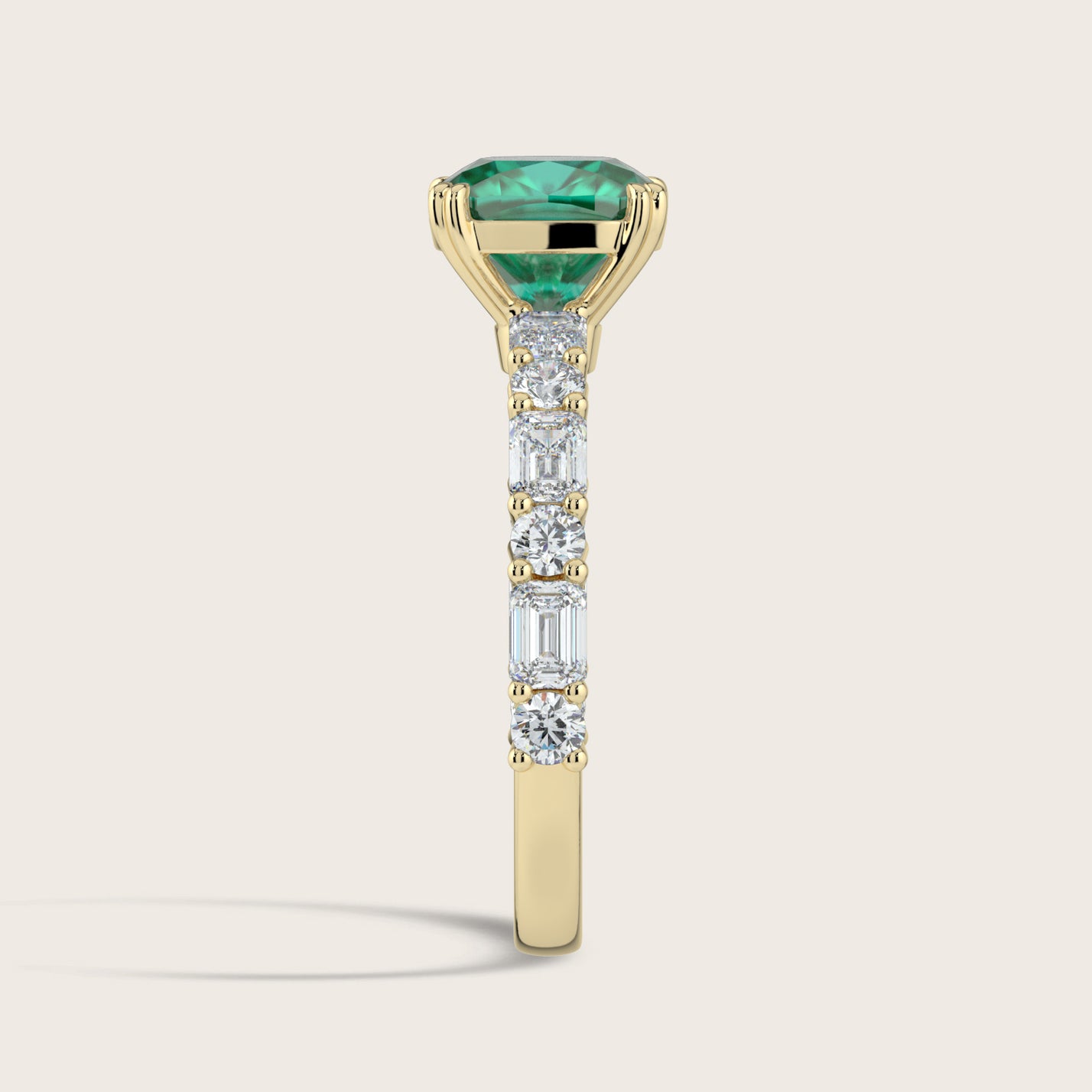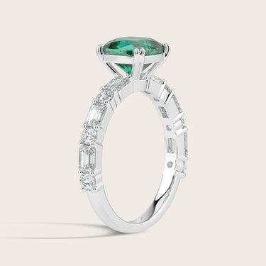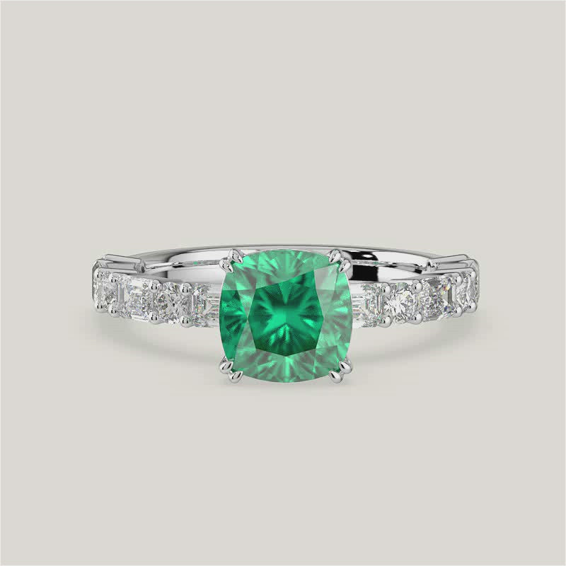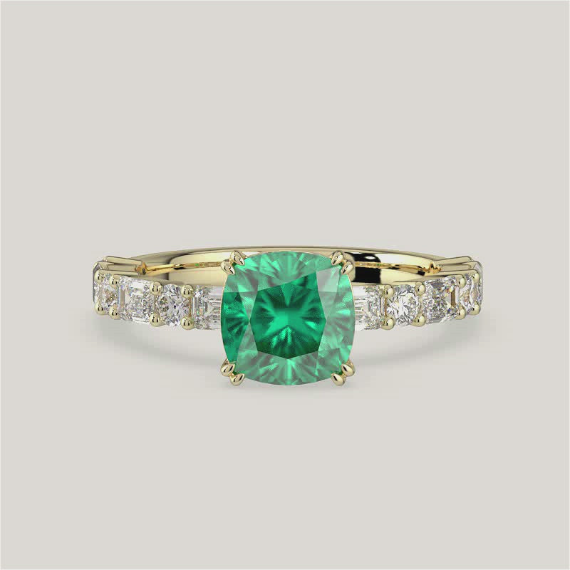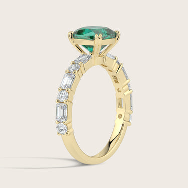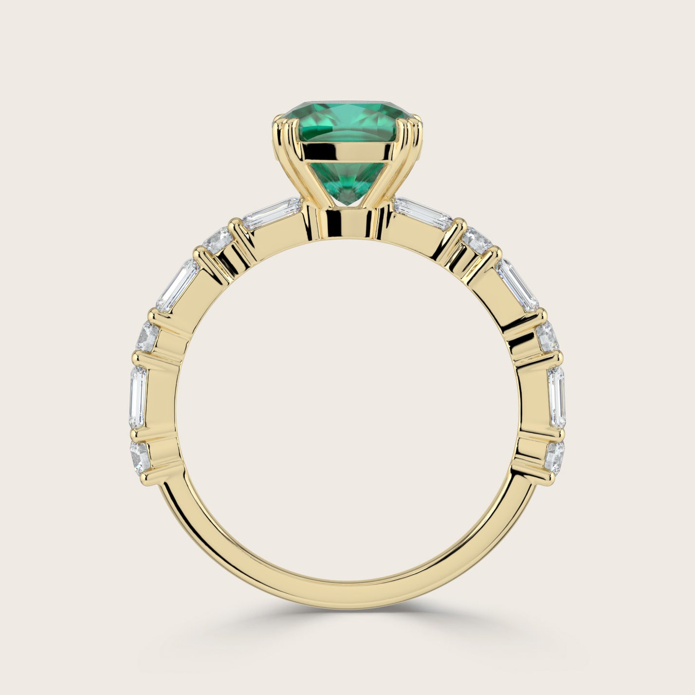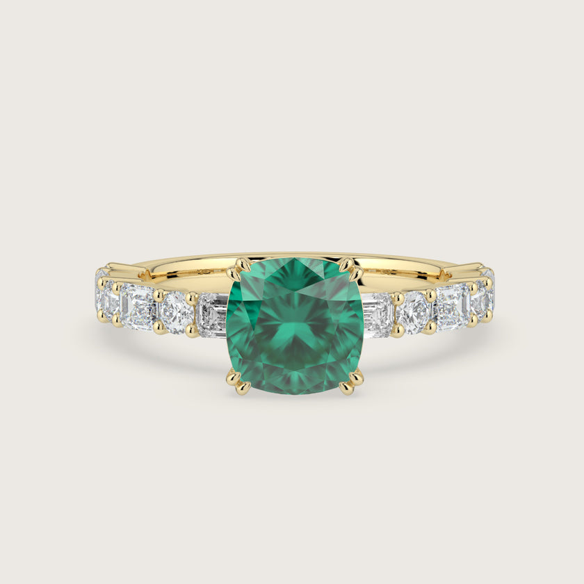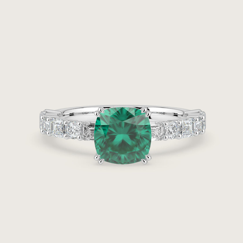 Edith, Cushion Cut Emerald Ring with Round & Baguette Pavé