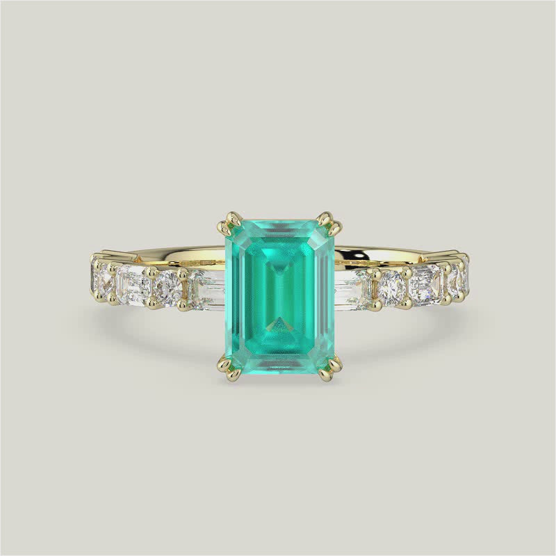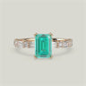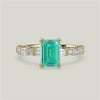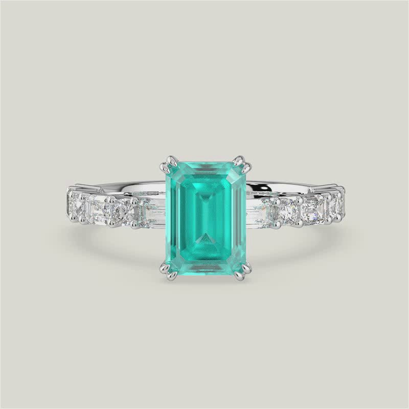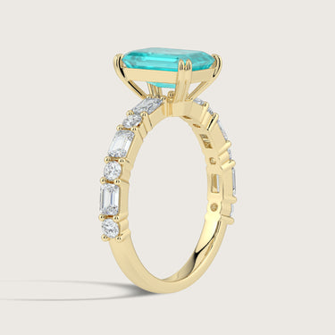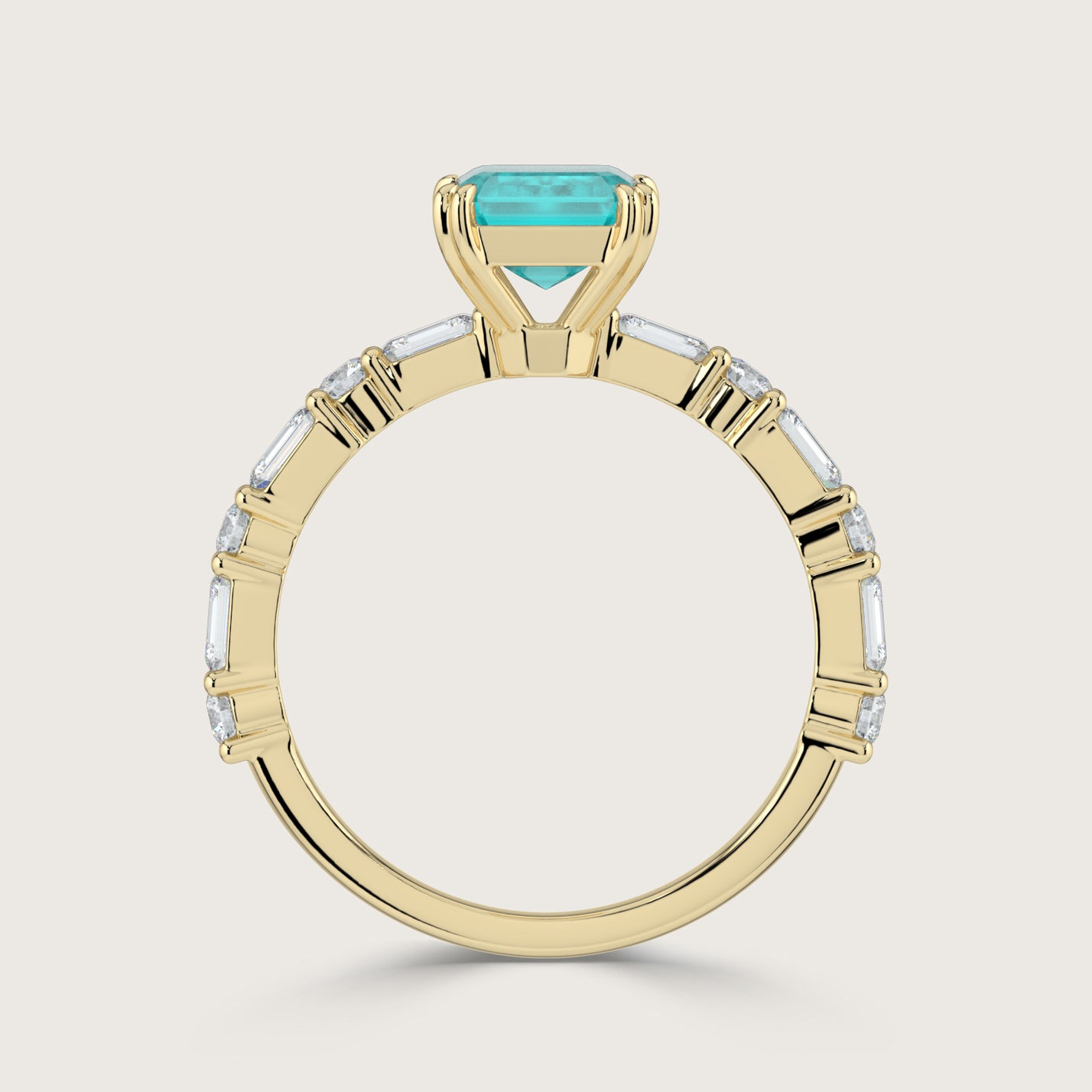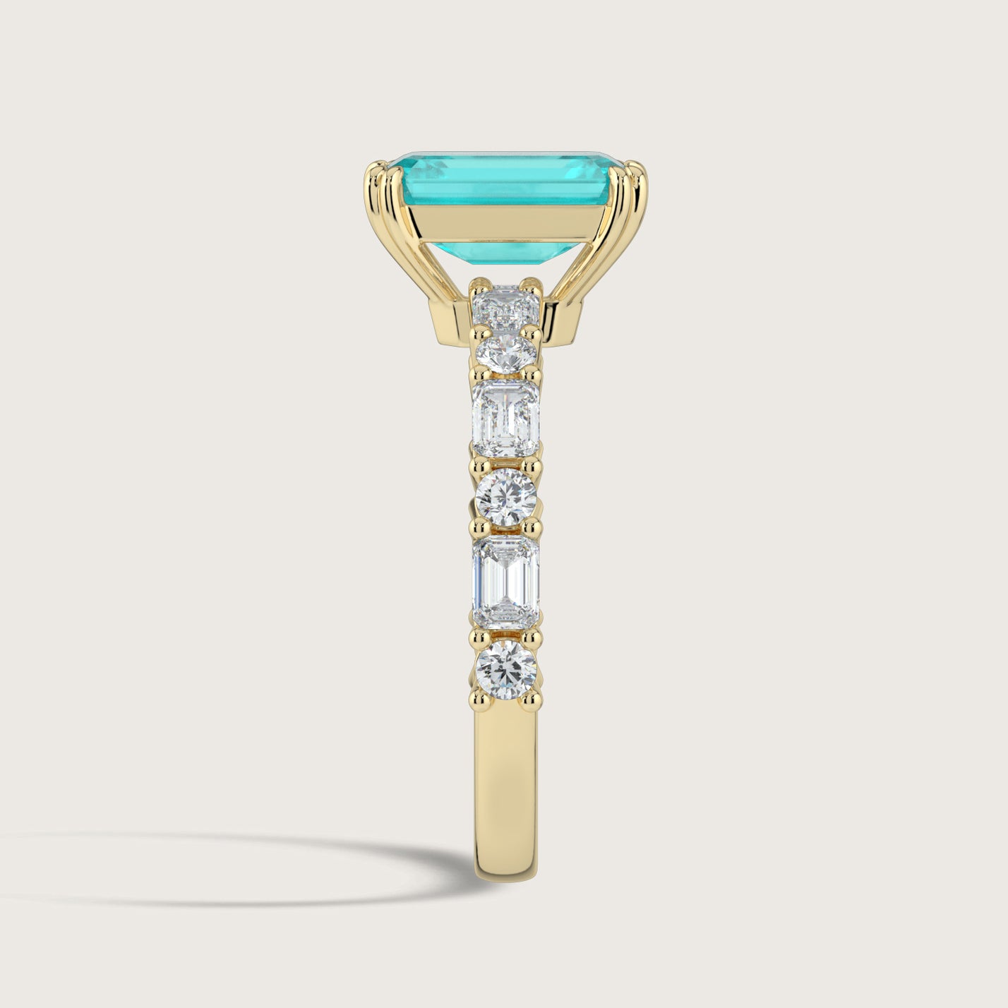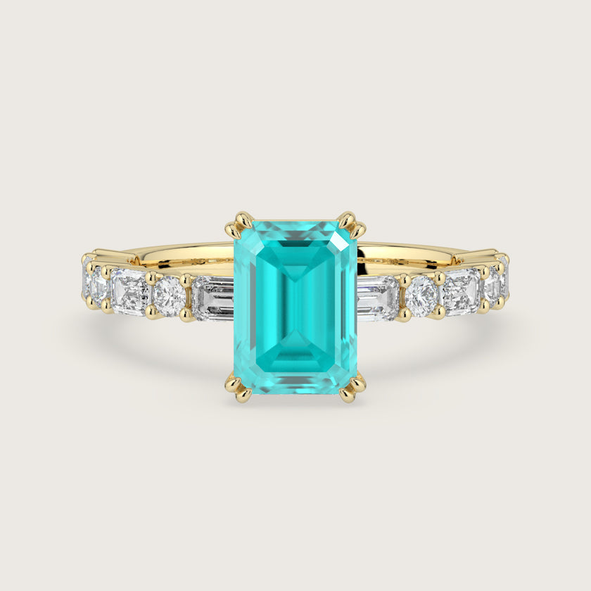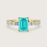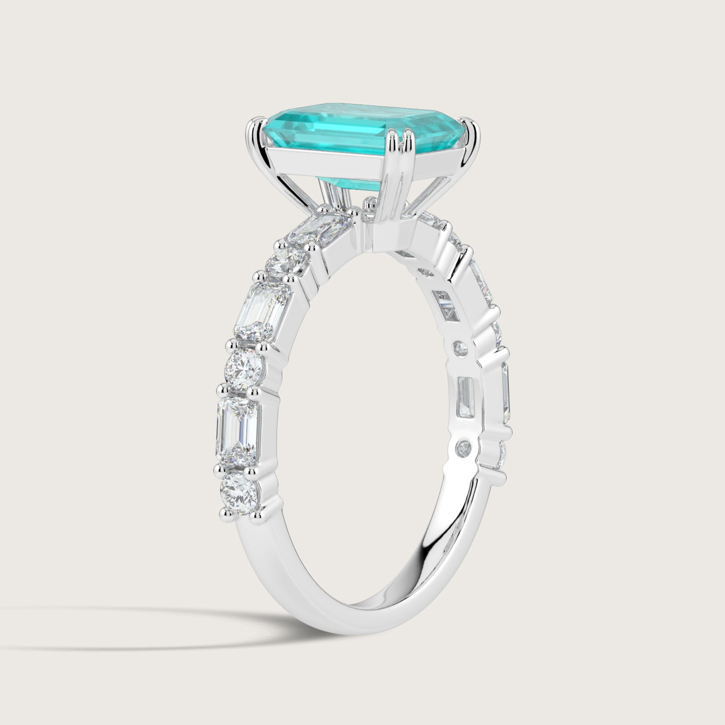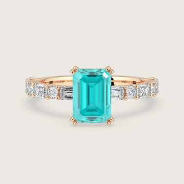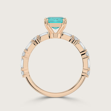 Edith, Emerald Cut Paraiba Garnet Ring with Round & Baguette Pavé