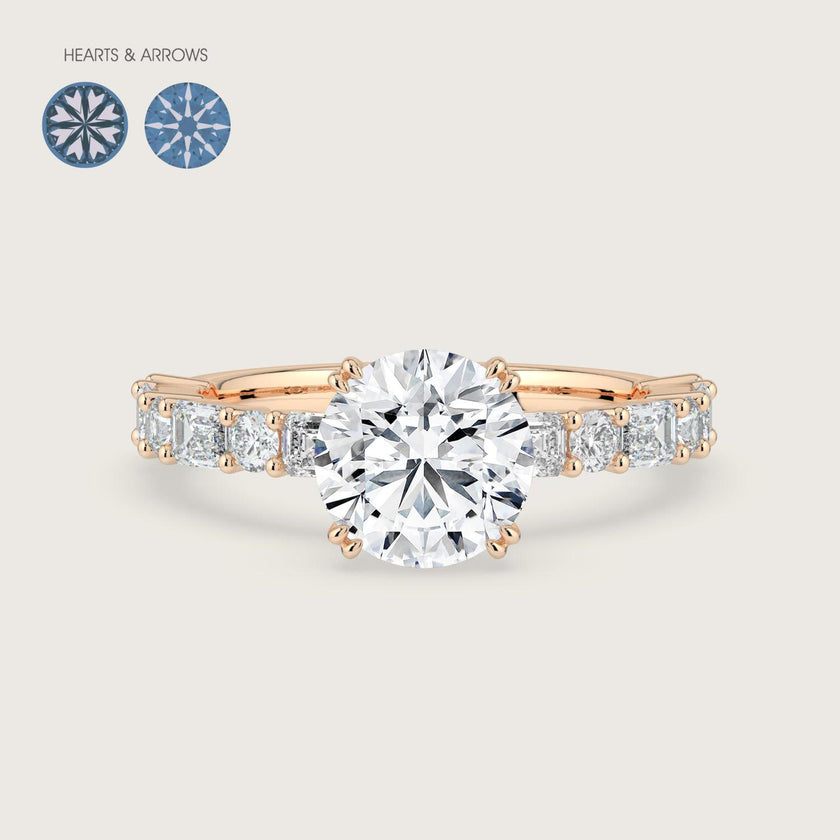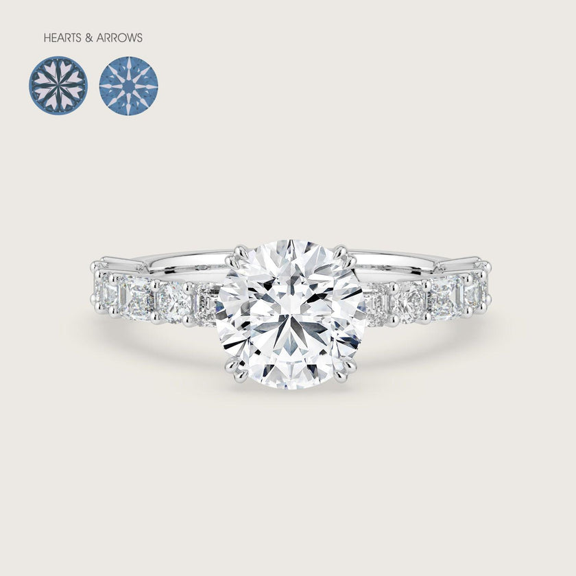 Edith, Hearts & Arrows Diamond Ring with Round & Baguette Pavé