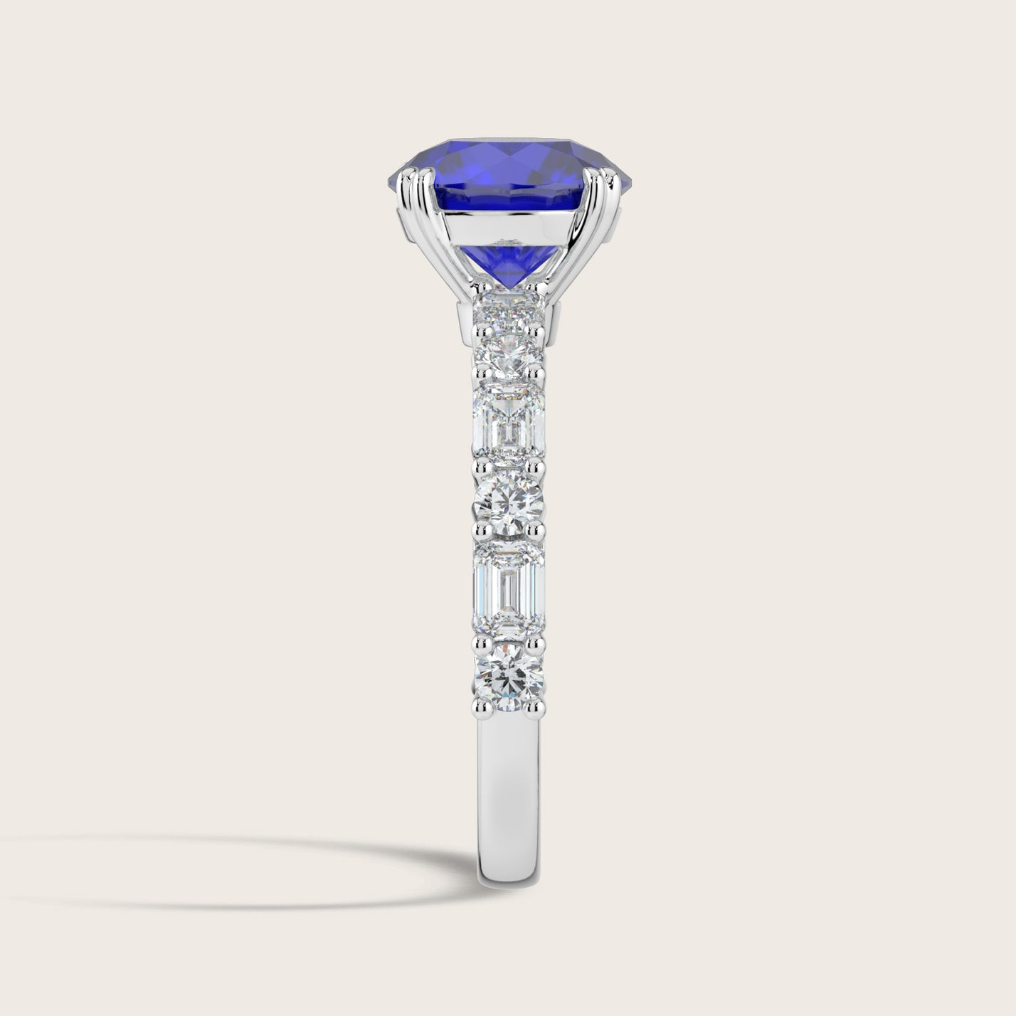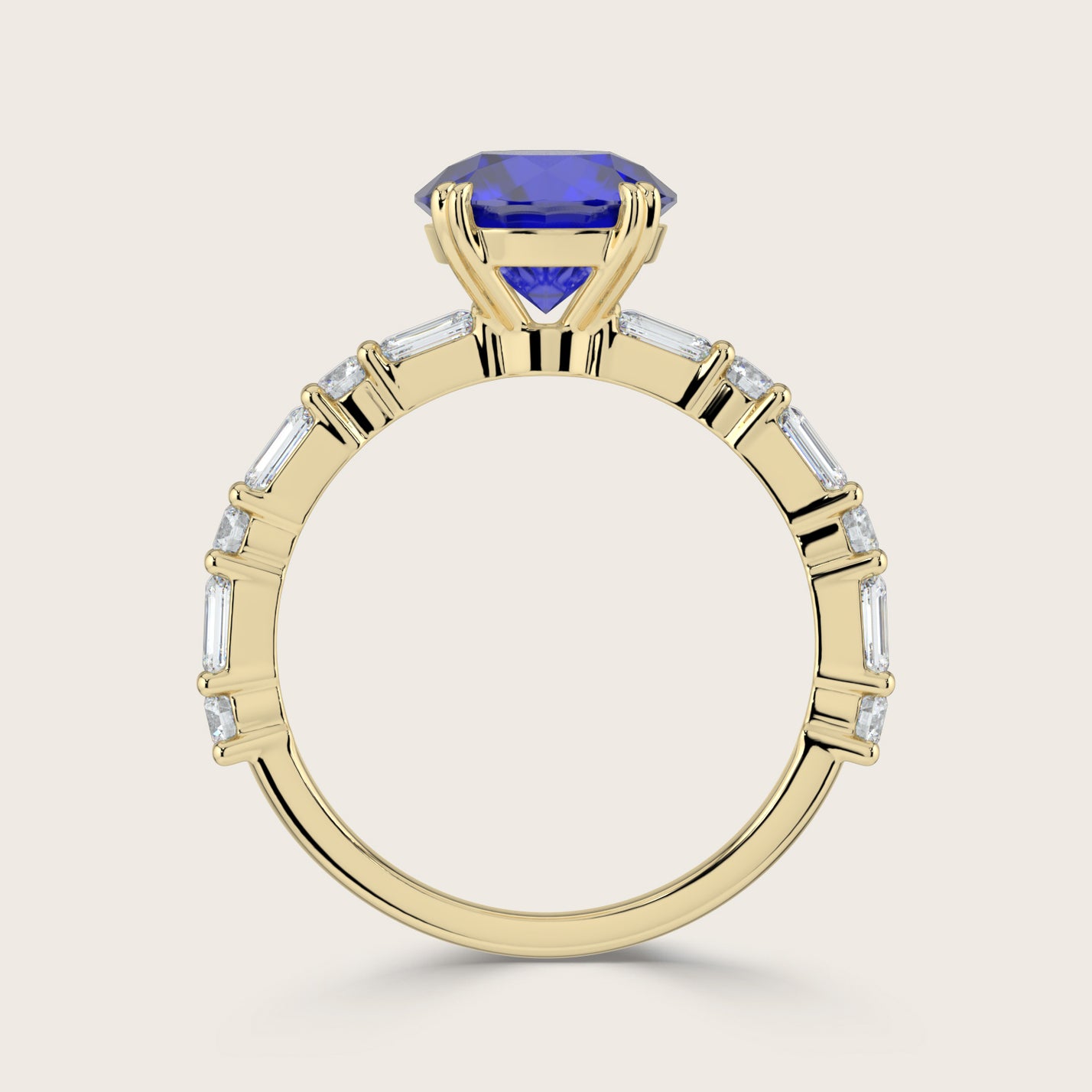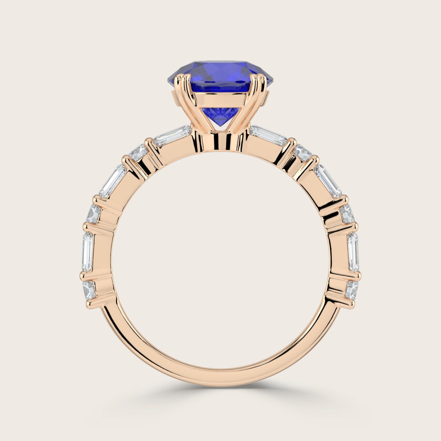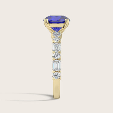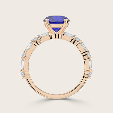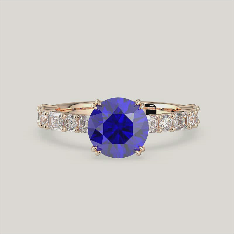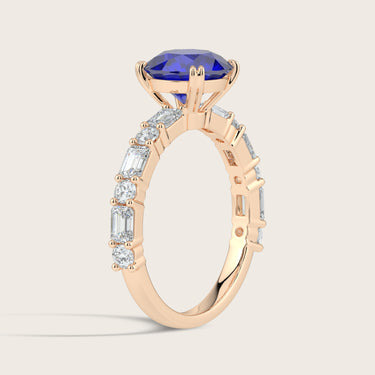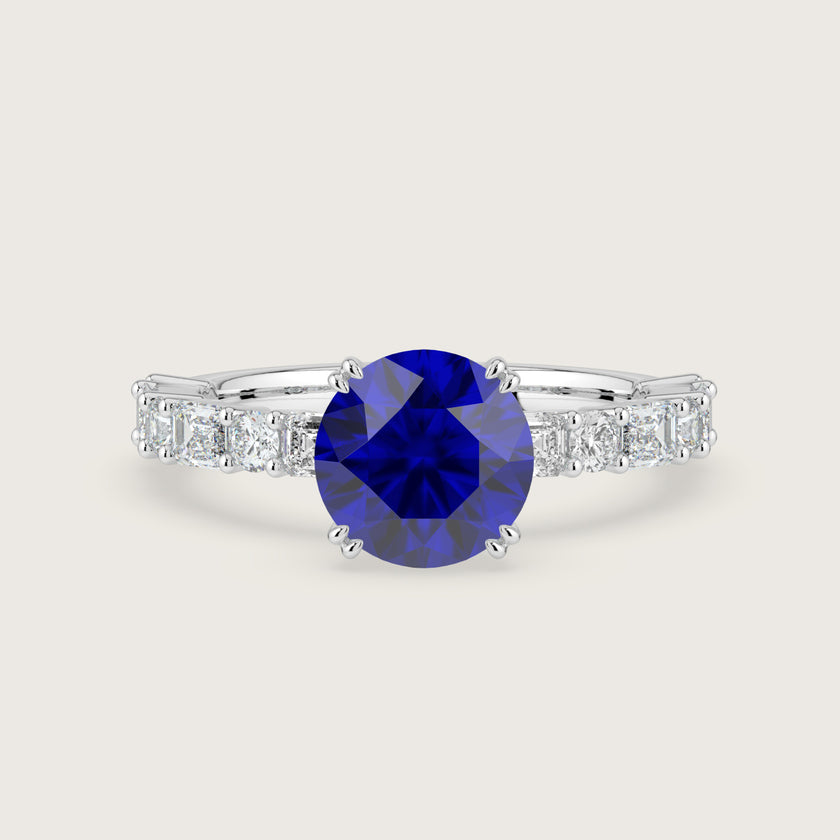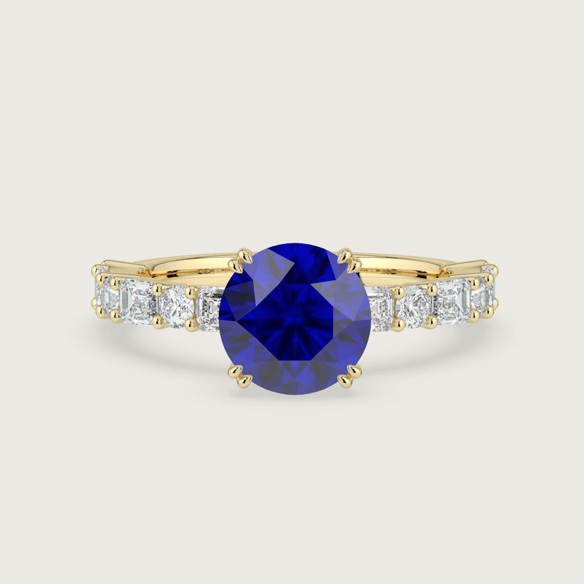 Edith, Round Brilliant Sapphire Ring with Round & Baguette Pavé