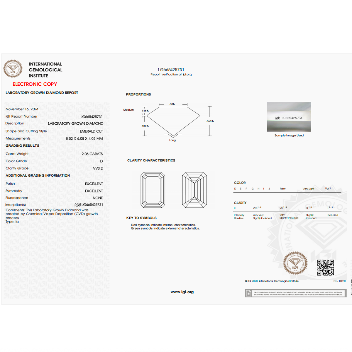 All our lab-grown diamonds over 0.5ct and gemstones over 2.0ct come with a dedicated IGI report. For designs set with three or more gemstones and a total carat weight of 2 carats or above, we provide an IGI jewellery report instead.