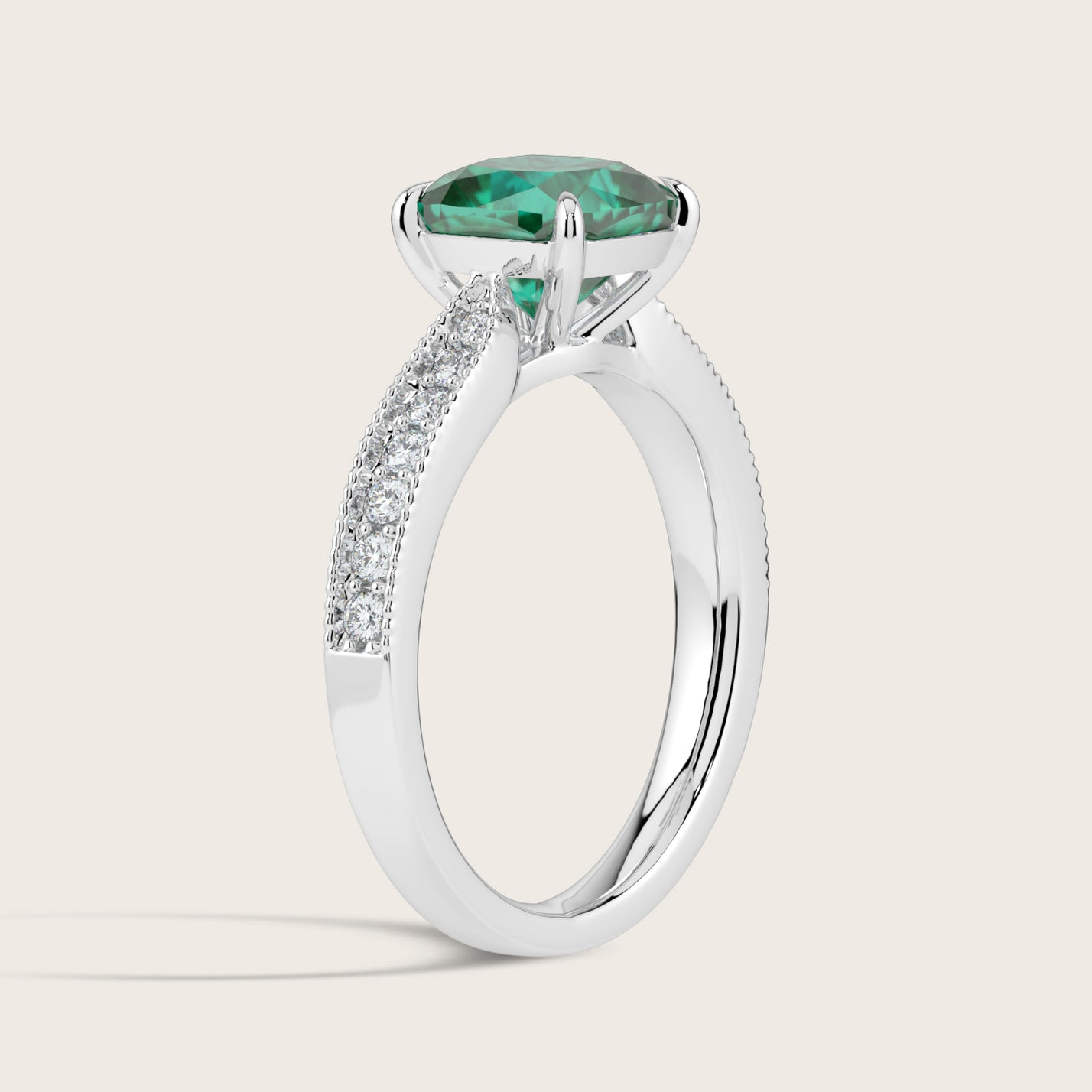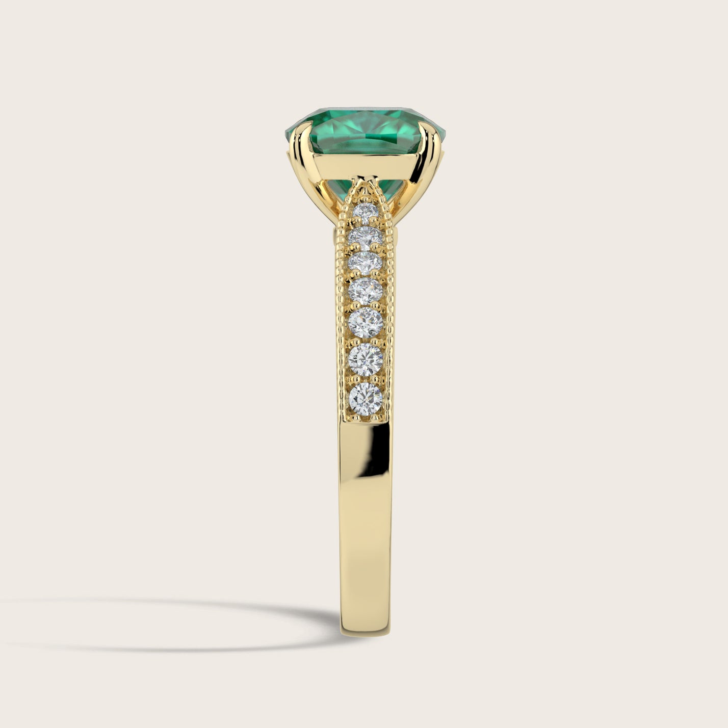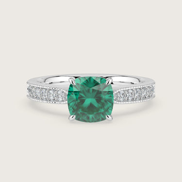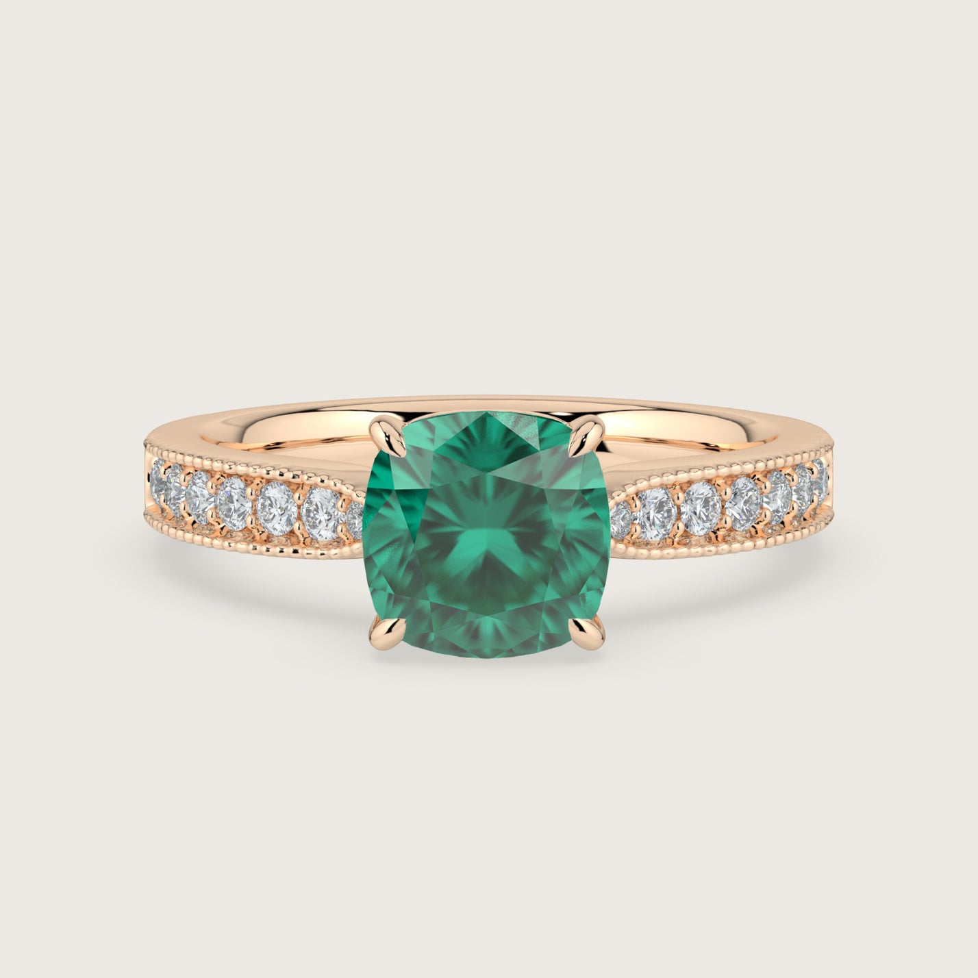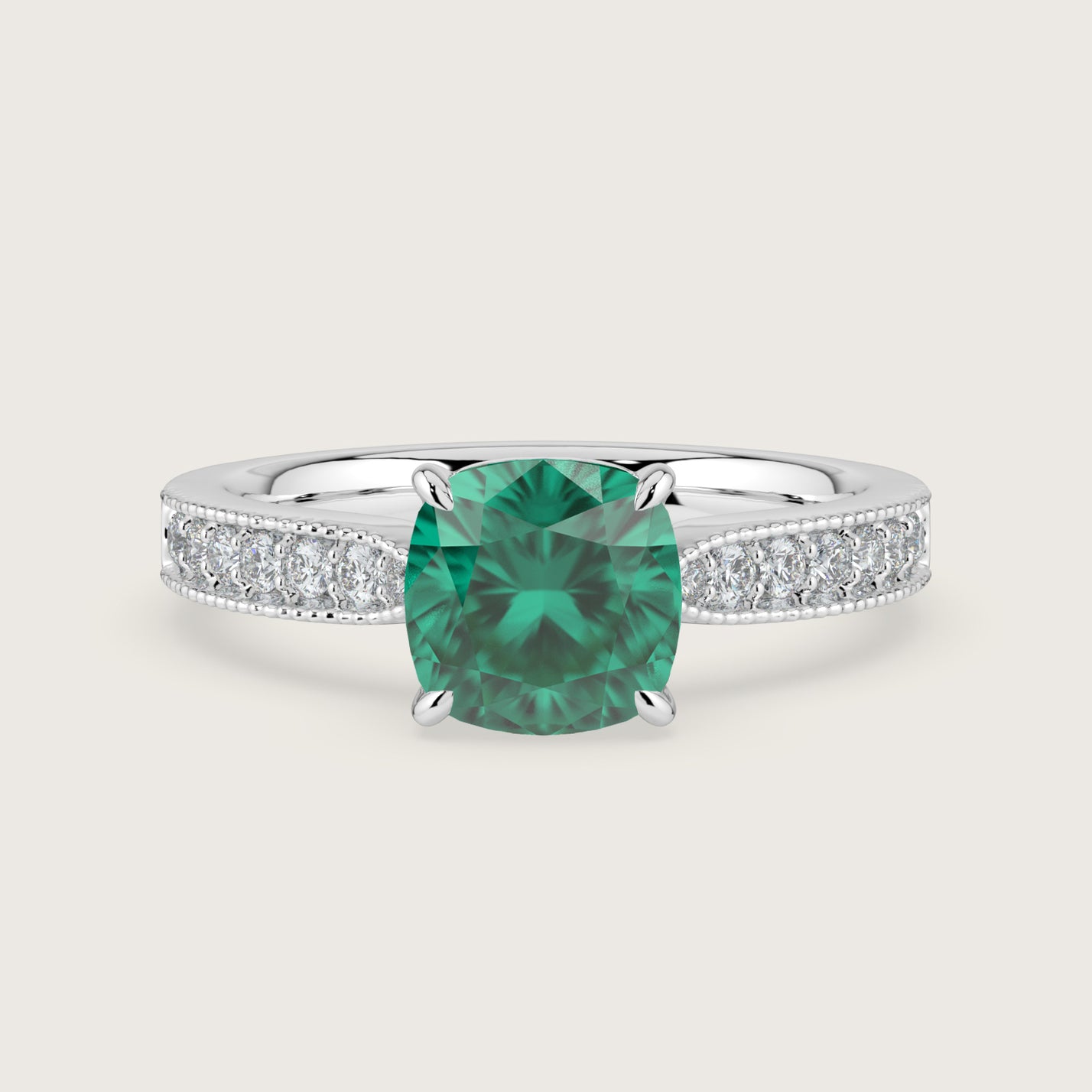 Emilie, Vintage Milgrain Cushion Cut Emerald Pavé Ring