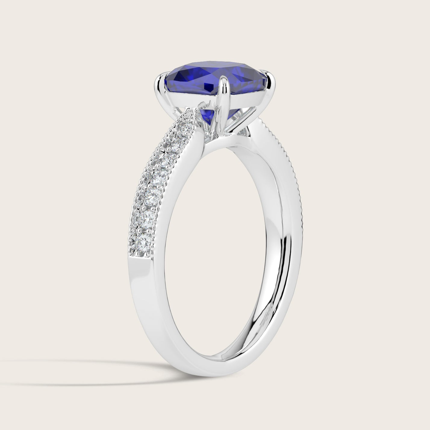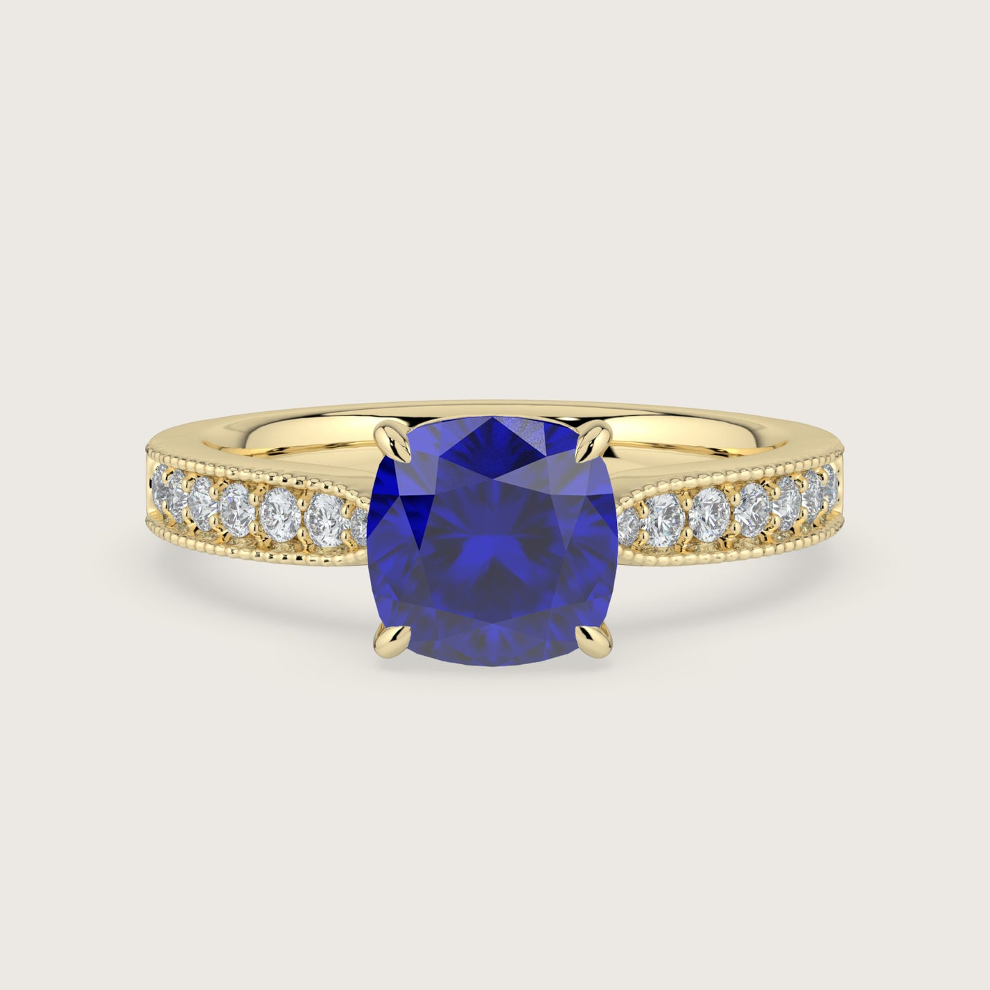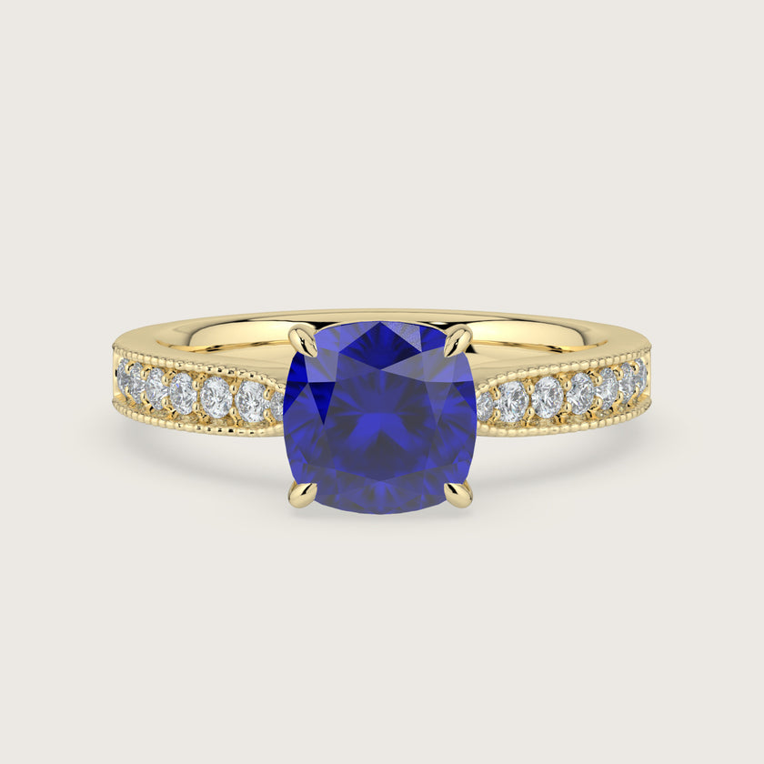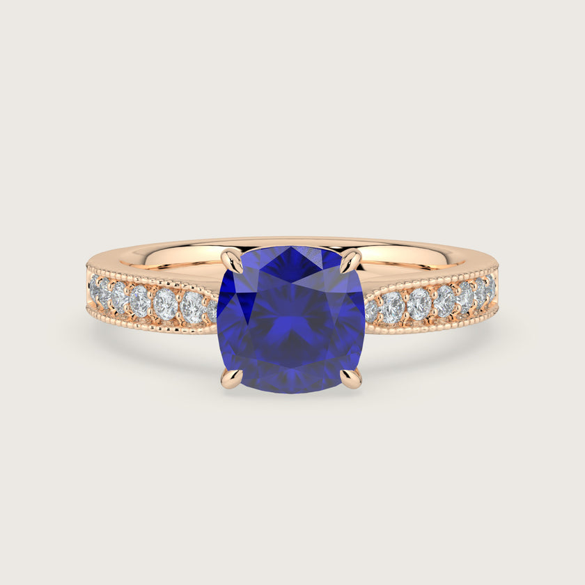 Emilie, Vintage Milgrain Cushion Cut Sapphire Pavé Ring