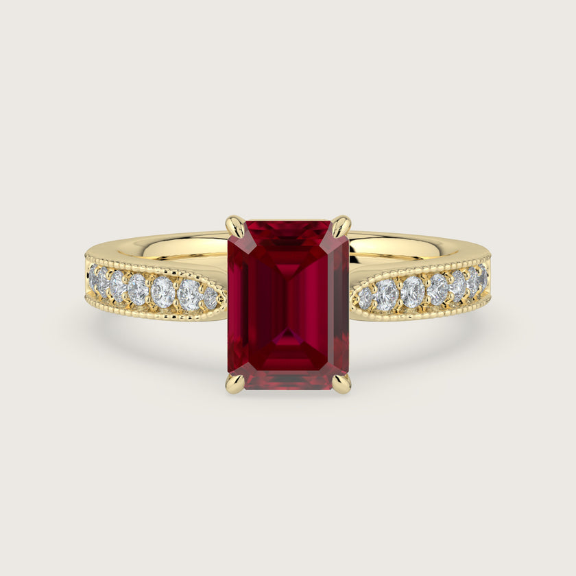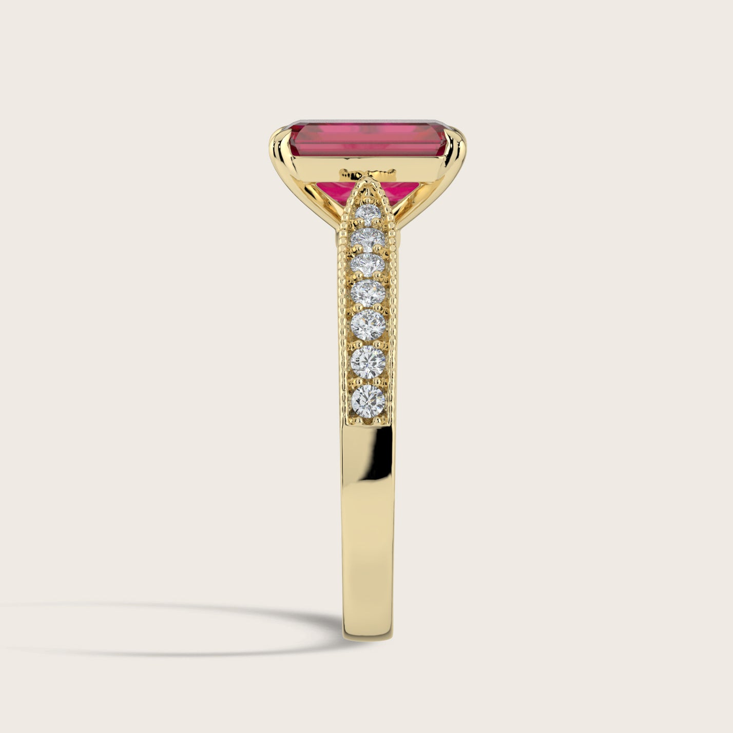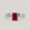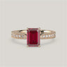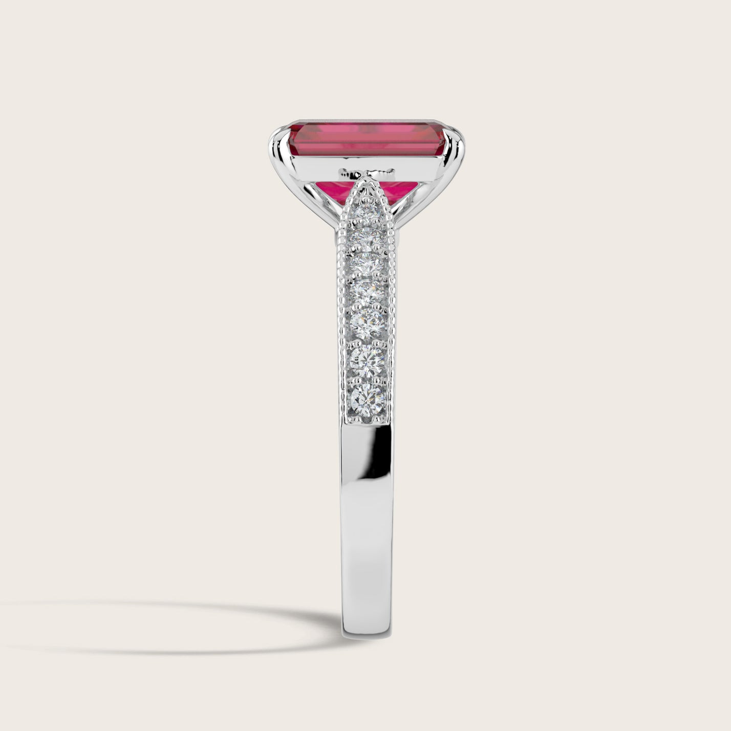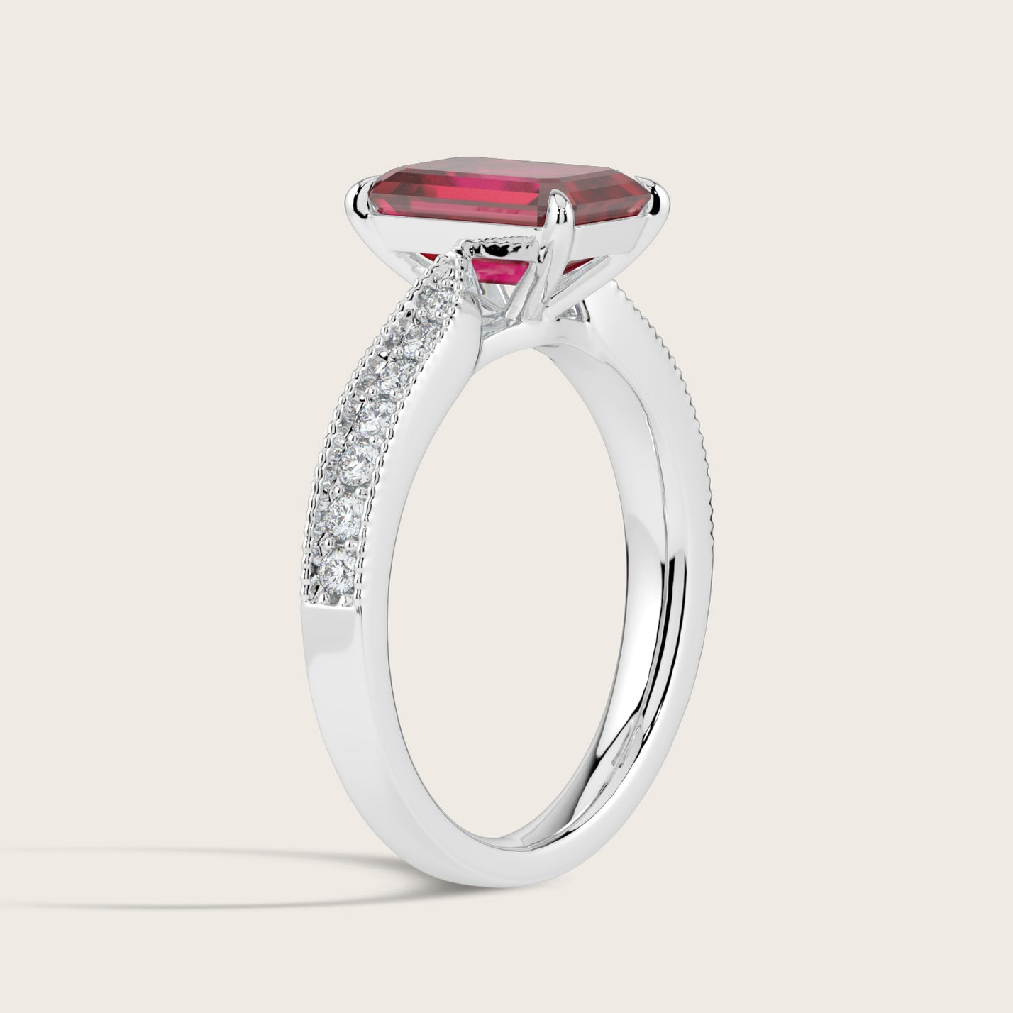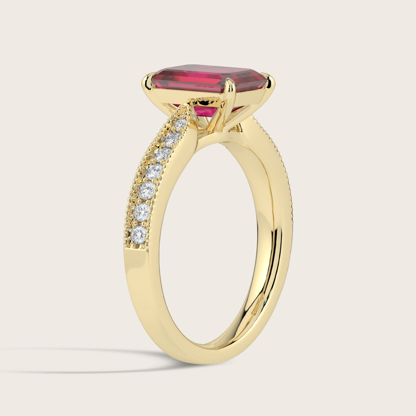 Emilie, Vintage Milgrain Emerald Cut Ruby Pavé Ring