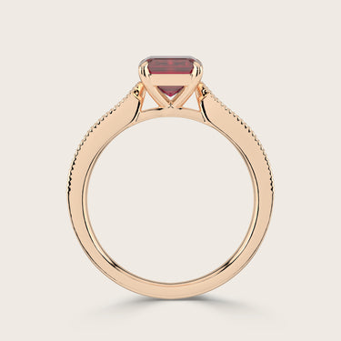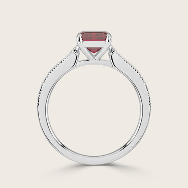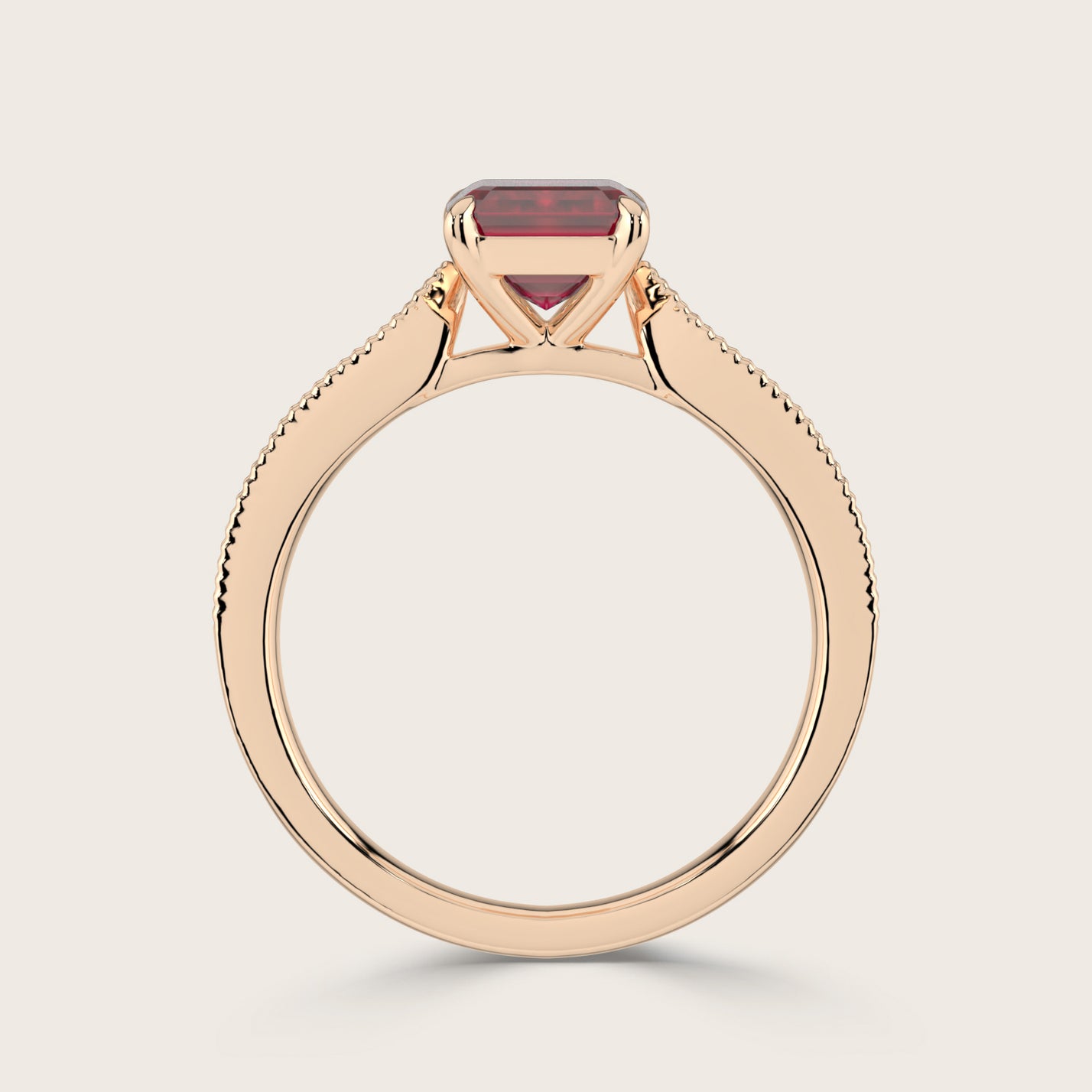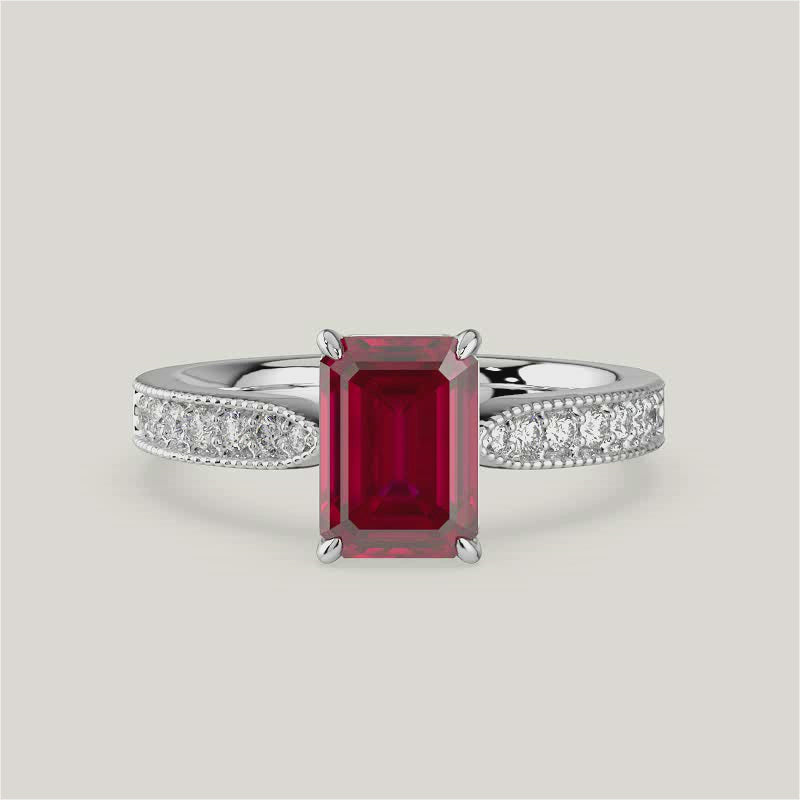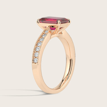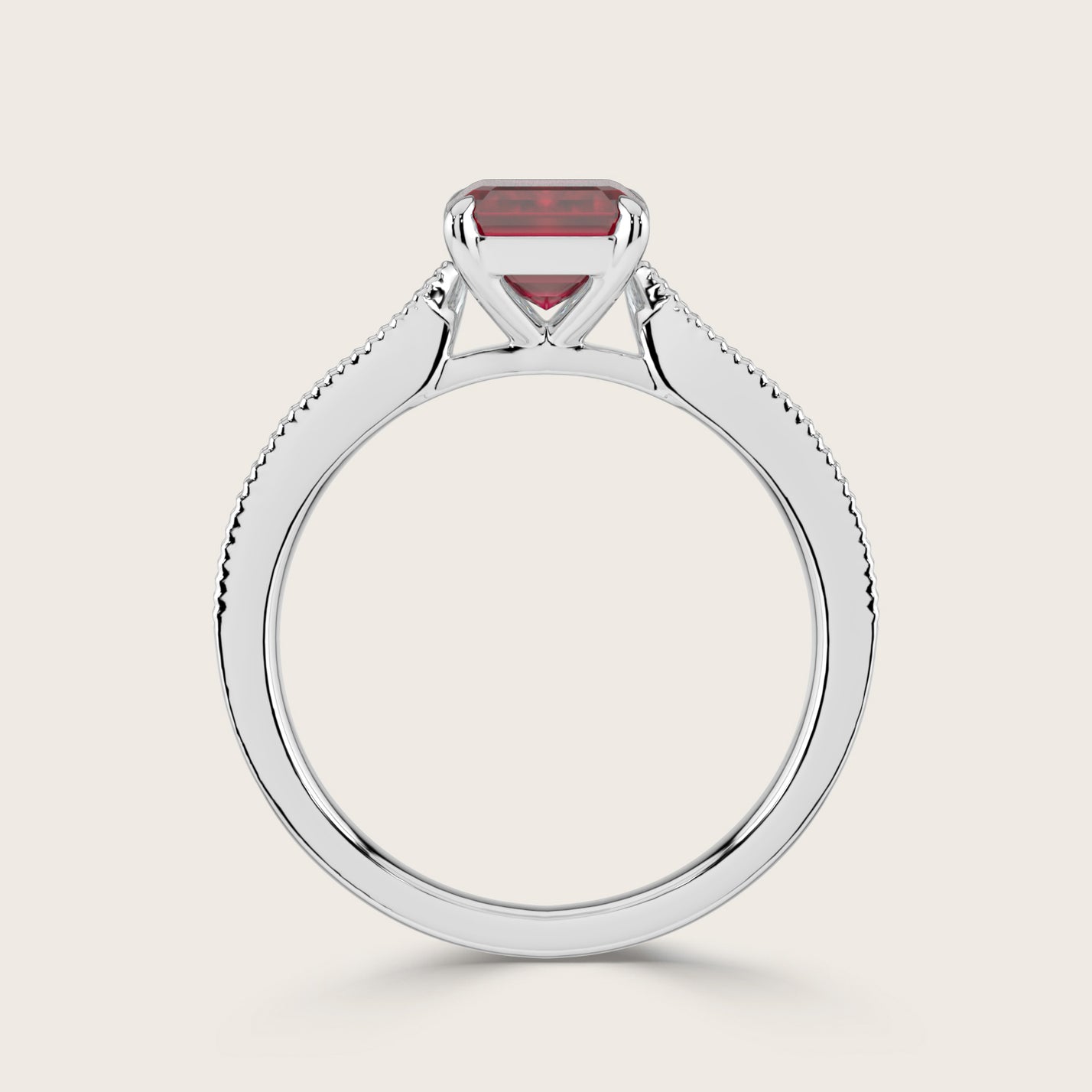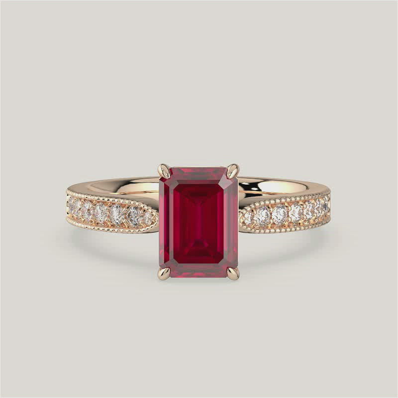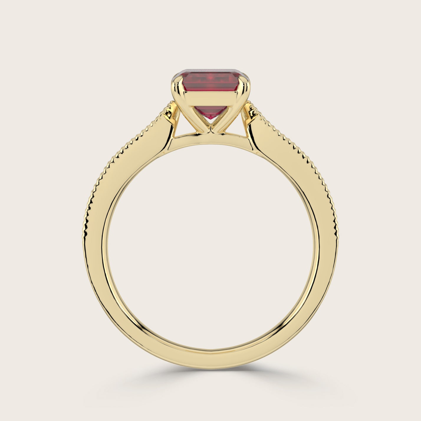 Emilie, Vintage Milgrain Emerald Cut Ruby Pavé Ring