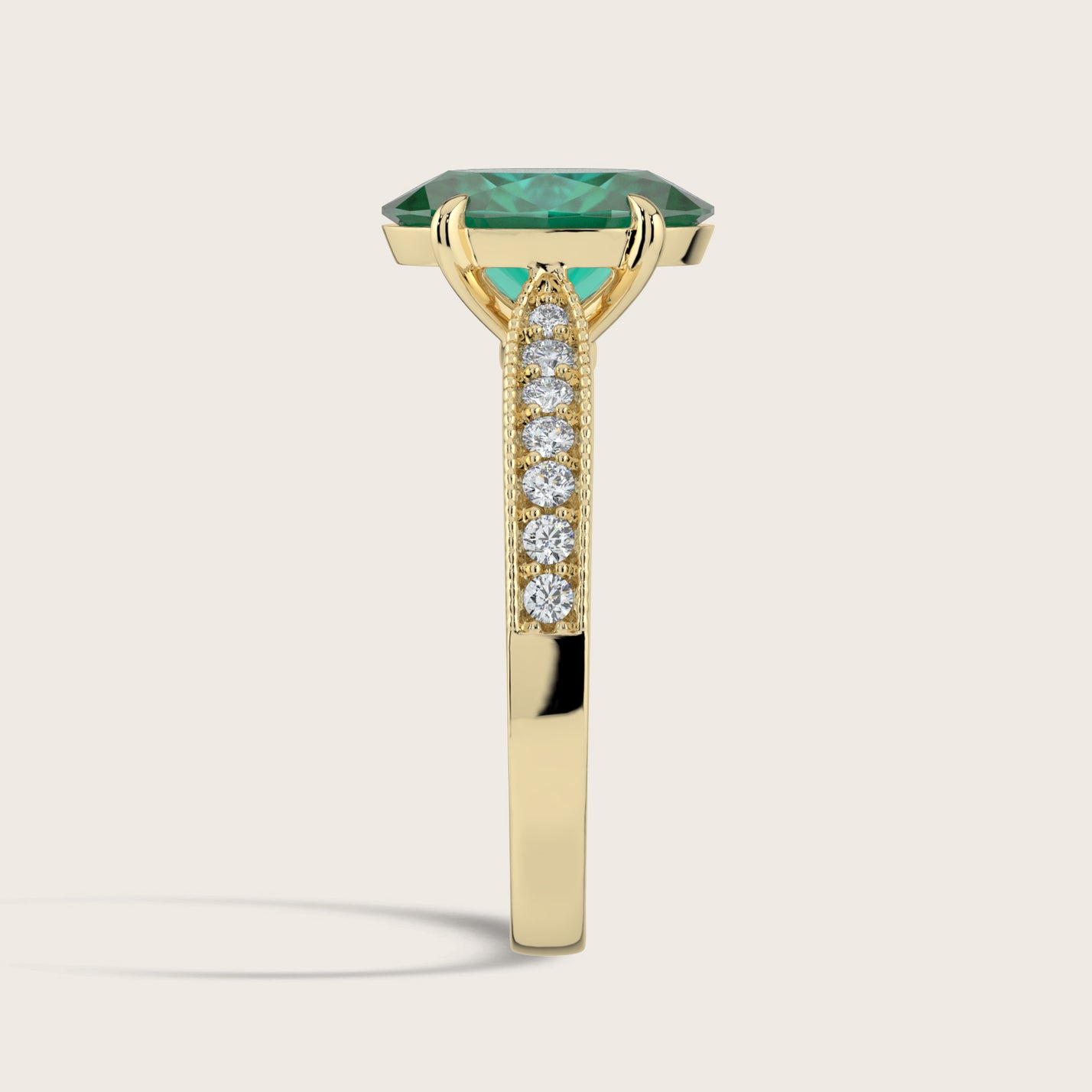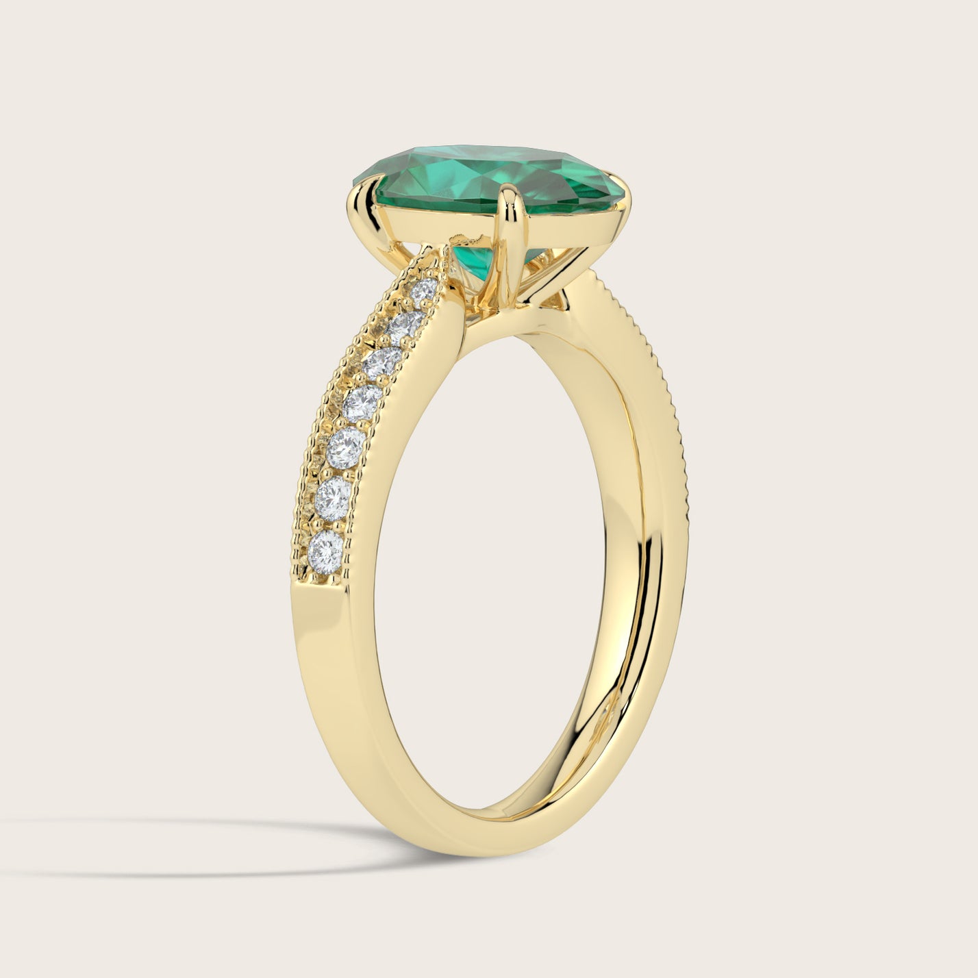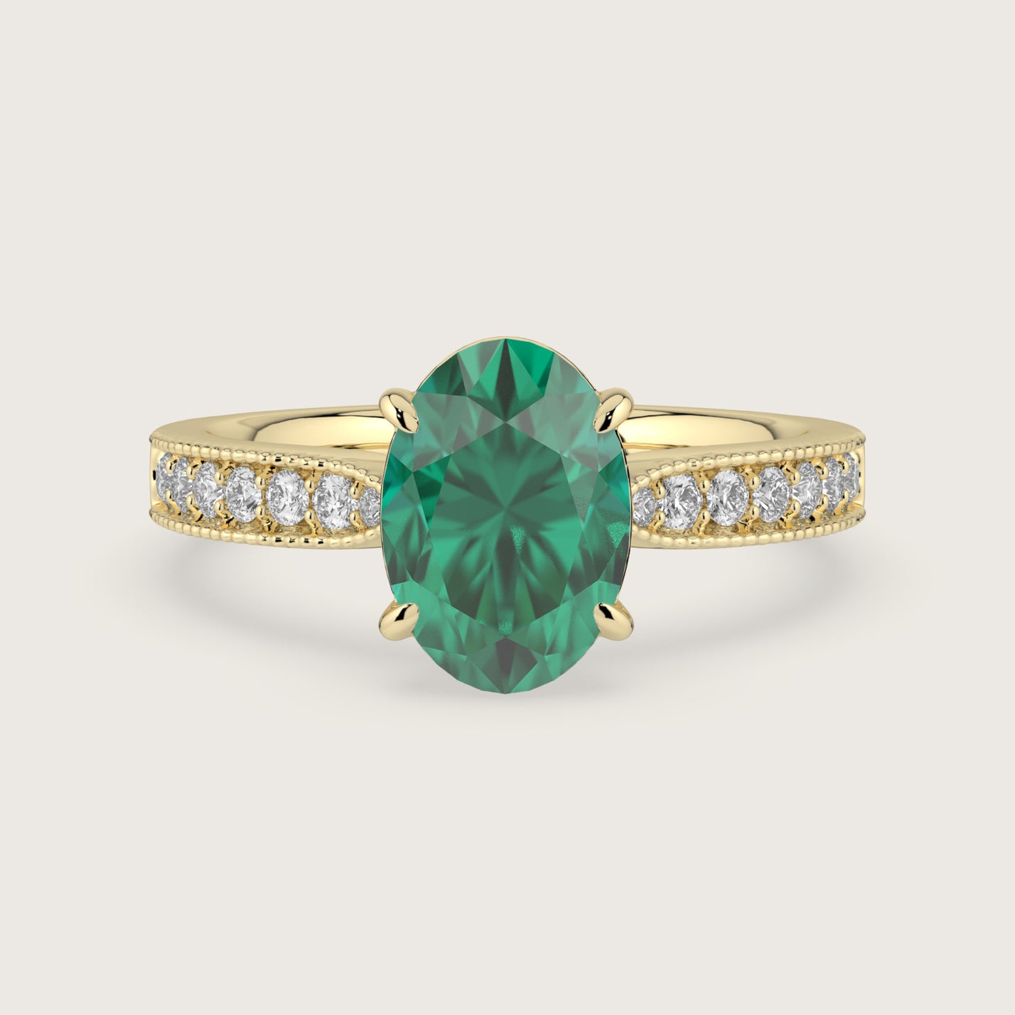 Emilie, Vintage Milgrain Oval Cut Emerald Pavé Ring