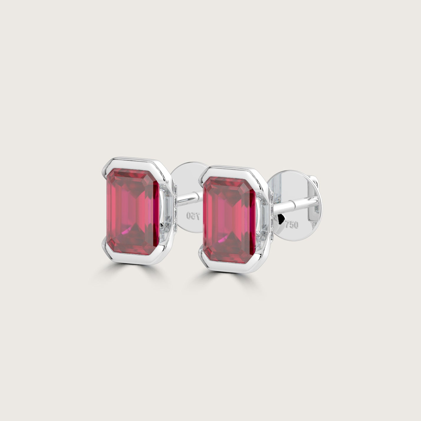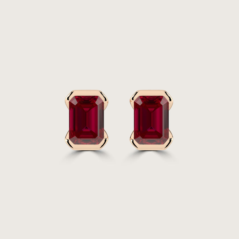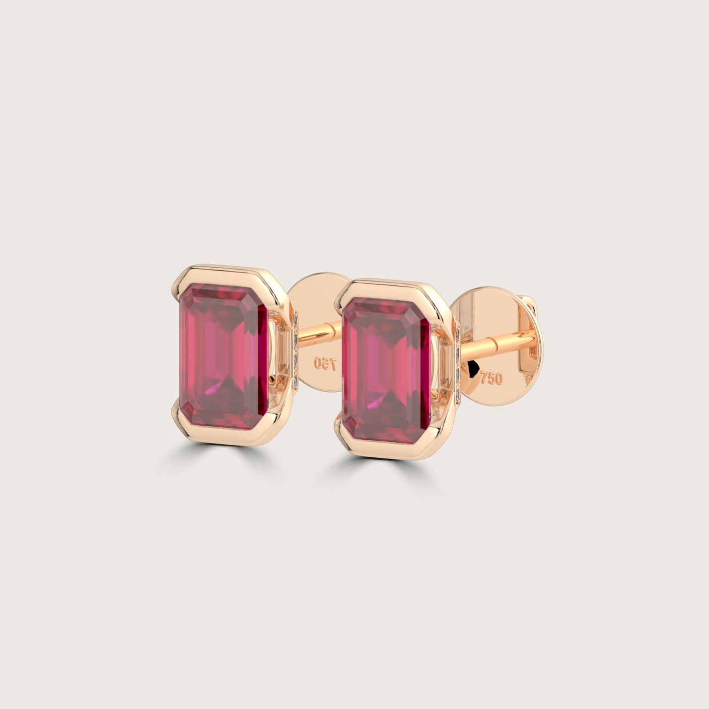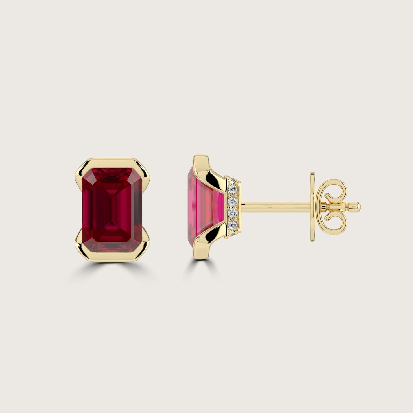 Half Bezel Set Emerald Cut Ruby Stud Earrings