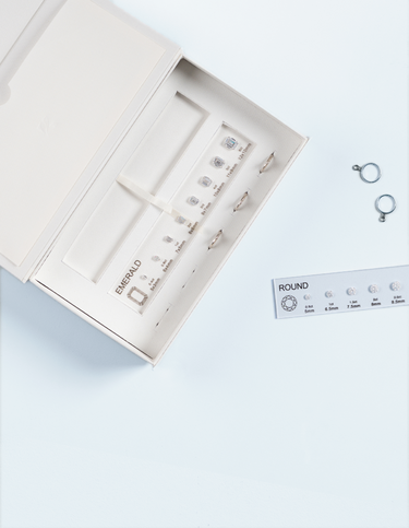 Choose your two favourite stone shapes and estimated ring size. We’ll send samples of both shapes plus five ring sizers — your size and two above and below — to help you find the perfect fit.