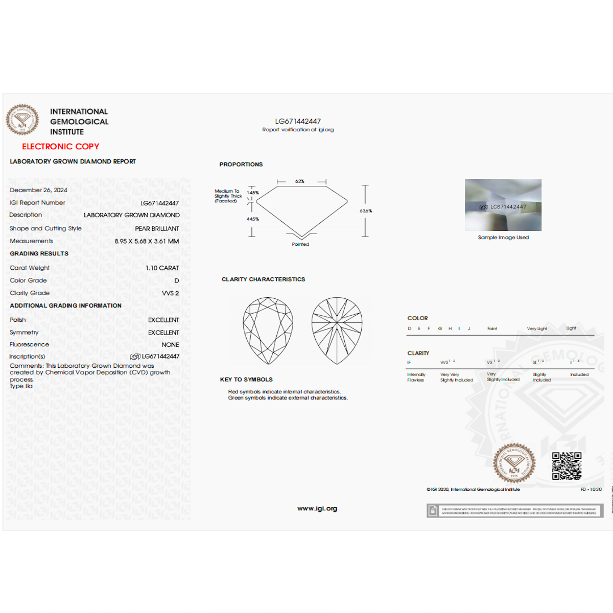 All our lab-grown diamonds over 0.5ct and gemstones over 2.0ct come with a dedicated IGI report. For designs set with three or more gemstones and a total carat weight of 2 carats or above, we provide an IGI jewellery report instead.